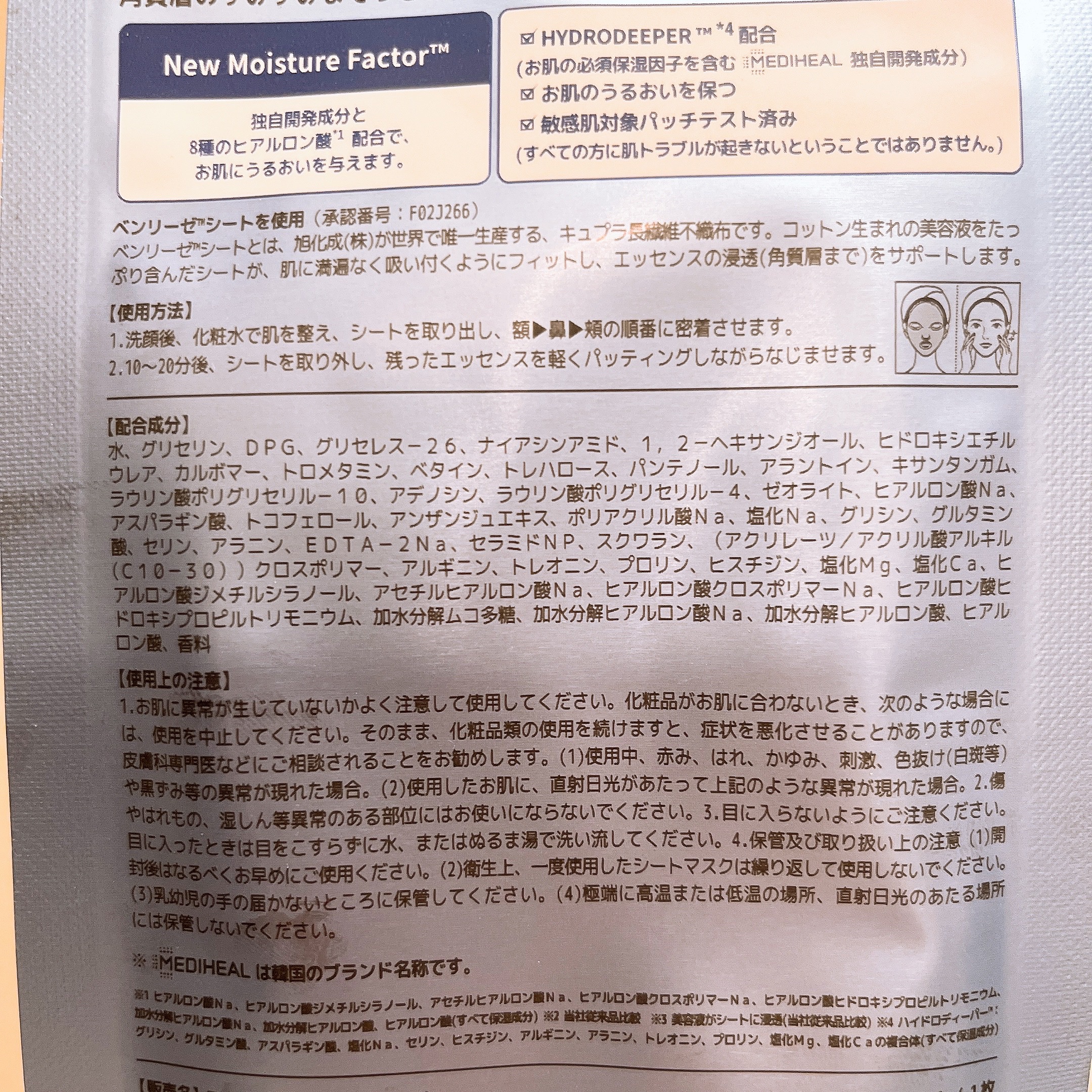 - 必須保湿因子を含む、メディヒール独自開発成分であるHYDRODEEPER™と8種のヒアルロン酸配合により、角質層のすみずみまでうるおいをチャージし、乾燥からお肌を守ります。高密着なシートでお顔の隅々までカバーし、潤いを与えます。