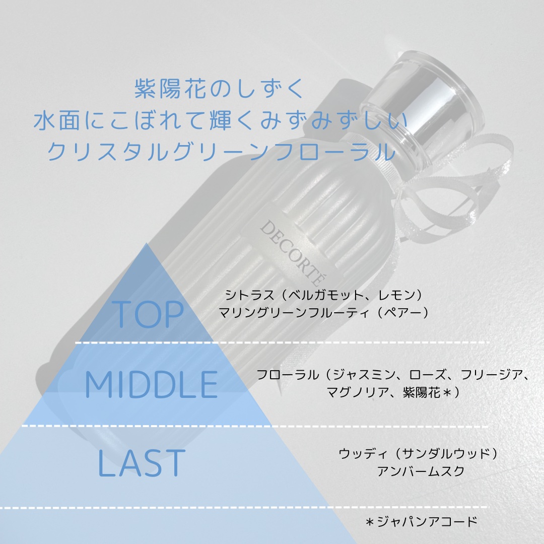 - 紫陽花のしずくが水面にこぼれて輝く みずみずしいクリスタルグリーンフローラル 清々しく爽やかなグリーンやシトラスへ、華やかに澄みわたる紫陽花をイメージしたフローラルブーケが、未来を照らすようにやわらかに広がります。 ラストは魅惑的なウッディやアンバー、ムスクへと移ろい、清らかさと華やかな奥行きが共 存する輝きに満たされます。 PERFUMER:SHOJI KUMASAKA