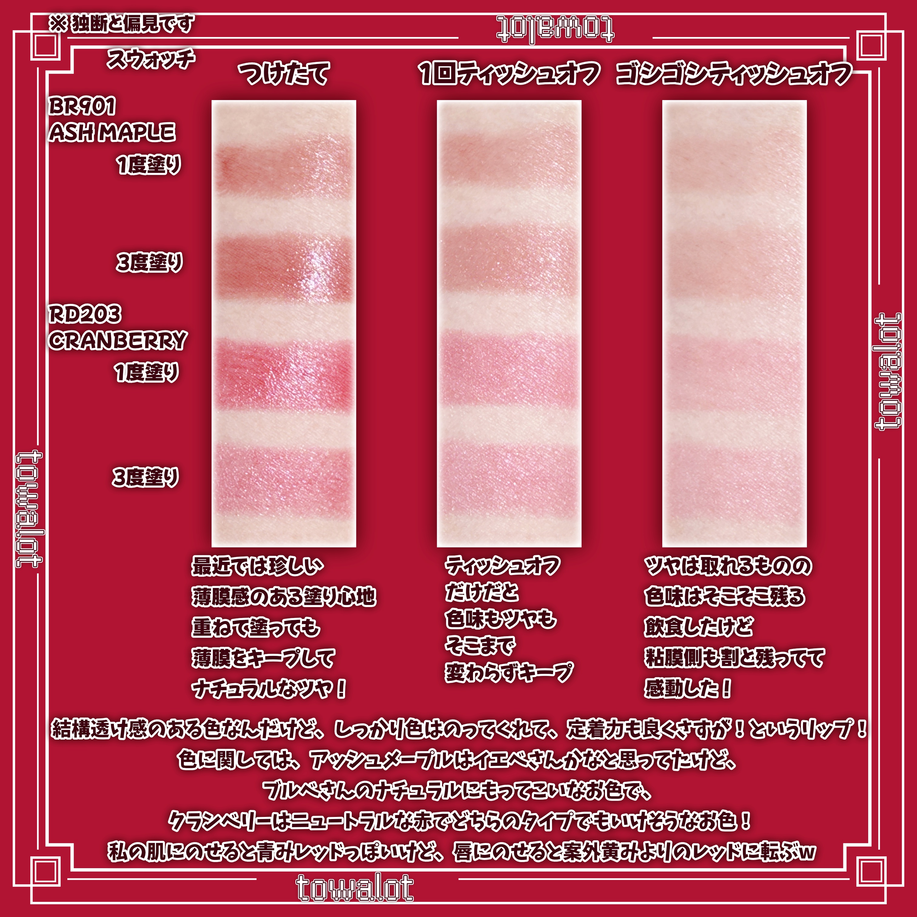 - <01 ヴィヴィディ(Vividy)【EC展開カラー】> ペンタイソステアリン酸ジペンタエリスリチル、トリ(カプリル酸/カプリン酸)グリセリル、ラウロイルグルタミン酸ジ(フィトステリル/オクチルドデシル)、オクチルドデカノール、グリセリルウンデシルジメチコン、ジフェニルジメチコン、合成ワックス、ダイマージリノール酸(フィトステリル/イソステアリル/セチル/ステアリル/ベヘニル)、トリイソステアリン酸ポリグリセリル-2、(アクリレーツ/アクリル酸ステアリル/メタクリル酸ジメチコン)コポリマー、ラウリルポリグリセリル-3ポリジメチルシロキシエチルジメチコン、(エチレン/プロピレン)コポリマー、ジメチコン、ポリヒドロキシステアリン酸、香料、レシチン、パルミチン酸エチルヘキシル、イソステアリン酸、ミリスチン酸イソプロピル、ポリリシノレイン酸ポリグリセリル-3、水酸化Al、トリエトキシカプリリルシラン、トコフェロール、赤226、黄5、赤104(1)、酸化チタン、赤201 <02 ベリーコア(Berry Core)> ペンタイソステアリン酸ジペンタエリスリチル、トリ(カプリル酸/カプリン酸)グリセリル、オクチルドデカノール、ラウロイルグルタミン酸ジ(フィトステリル/オクチルドデシル)、グリセリルウンデシルジメチコン、ジフェニルジメチコン、合成ワックス、ダイマージリノール酸(フィトステリル/イソステアリル/セチル/ステアリル/ベヘニル)、トリイソステアリン酸ポリグリセリル-2、(アクリレーツ/アクリル酸ステアリル/メタクリル酸ジメチコン)コポリマー、ラウリルポリグリセリル-3ポリジメチルシロキシエチルジメチコン、(エチレン/プロピレン)コポリマー、ジメチコン、香料、トコフェロール、赤202、赤201、黄5、酸化鉄 <03 クランベリー(Cranberry)【EC展開カラー】> ペンタイソステアリン酸ジペンタエリスリチル、オクチルドデカノール、トリ(カプリル酸/カプリン酸)グリセリル、ラウロイルグルタミン酸ジ(フィトステリル/オクチルドデシル)、グリセリルウンデシルジメチコン、ジフェニルジメチコン、合成ワックス、ダイマージリノール酸(フィトステリル/イソステアリル/セチル/ステアリル/ベヘニル)、トリイソステアリン酸ポリグリセリル-2、(アクリレーツ/アクリル酸ステアリル/メタクリル酸ジメチコン)コポリマー、ラウリルポリグリセリル-3ポリジメチルシロキシエチルジメチコン、(エチレン/プロピレン)コポリマー、ジメチコン、香料、リンゴ酸ジイソステアリル、トコフェロール、ポリヒドロキシステアリン酸、レシチン、トリエトキシカプリリルシラン、パルミチン酸エチルヘキシル、イソステアリン酸、ミリスチン酸イソプロピル、ポリリシノレイン酸ポリグリセリル-3、酸化鉄、黄5、赤202、赤230(1) <04 ヘイベスティ(Hey Bestie)【EC展開カラー】> ペンタイソステアリン酸ジペンタエリスリチル、トリ(カプリル酸/カプリン酸)グリセリル、ラウロイルグルタミン酸ジ(フィトステリル/オクチルドデシル)、オクチルドデカノール、ジフェニルジメチコン、グリセリルウンデシルジメチコン、合成ワックス、ダイマージリノール酸(フィトステリル/イソステアリル/セチル/ステアリル/ベヘニル)、トリイソステアリン酸ポリグリセリル-2、ラウリルポリグリセリル-3ポリジメチルシロキシエチルジメチコン、(アクリレーツ/アクリル酸ステアリル/メタクリル酸ジメチコン)コポリマー、ポリヒドロキシステアリン酸、(エチレン/プロピレン)コポリマー、ジメチコン、レシチン、香料、パルミチン酸エチルヘキシル、イソステアリン酸、ミリスチン酸イソプロピル、ポリリシノレイン酸ポリグリセリル-3、水酸化Al、トリエトキシカプリリルシラン、トコフェロール、酸化チタン、赤202、黄5、赤104(1)、酸化鉄、青1 <05 ブルーベリー(Blueberry)> ペンタイソステアリン酸ジペンタエリスリチル、トリ(カプリル酸/カプリン酸)グリセリル、ラウロイルグルタミン酸ジ(フィトステリル/オクチルドデシル)、オクチルドデカノール、グリセリルウンデシルジメチコン、ジフェニルジメチコン、合成ワックス、ダイマージリノール酸(フィトステリル/イソステアリル/セチル/ステアリル/ベヘニル)、トリイソステアリン酸ポリグリセリル-2、ラウリルポリグリセリル-3ポリジメチルシロキシエチルジメチコン、(アクリレーツ/アクリル酸ステアリル/メタクリル酸ジメチコン)コポリマー、(エチレン/プロピレン)コポリマー、ジメチコン、香料、水酸化Al、トリエトキシカプリリルシラン、トコフェロール、酸化チタン、酸化鉄、赤202、青1、赤104(1) <06 ニューローズ(New Rose)> ペンタイソステアリン酸ジペンタエリスリチル、トリ(カプリル酸/カプリン酸)グリセリル、ラウロイルグルタミン酸ジ(フィトステリル/オクチルドデシル)、オクチルドデカノール、ジフェニルジメチコン、グリセリルウンデシルジメチコン、合成ワックス、ダイマージリノール酸(フィトステリル/イソステアリル/セチル/ステアリル/ベヘニル)、トリイソステアリン酸ポリグリ