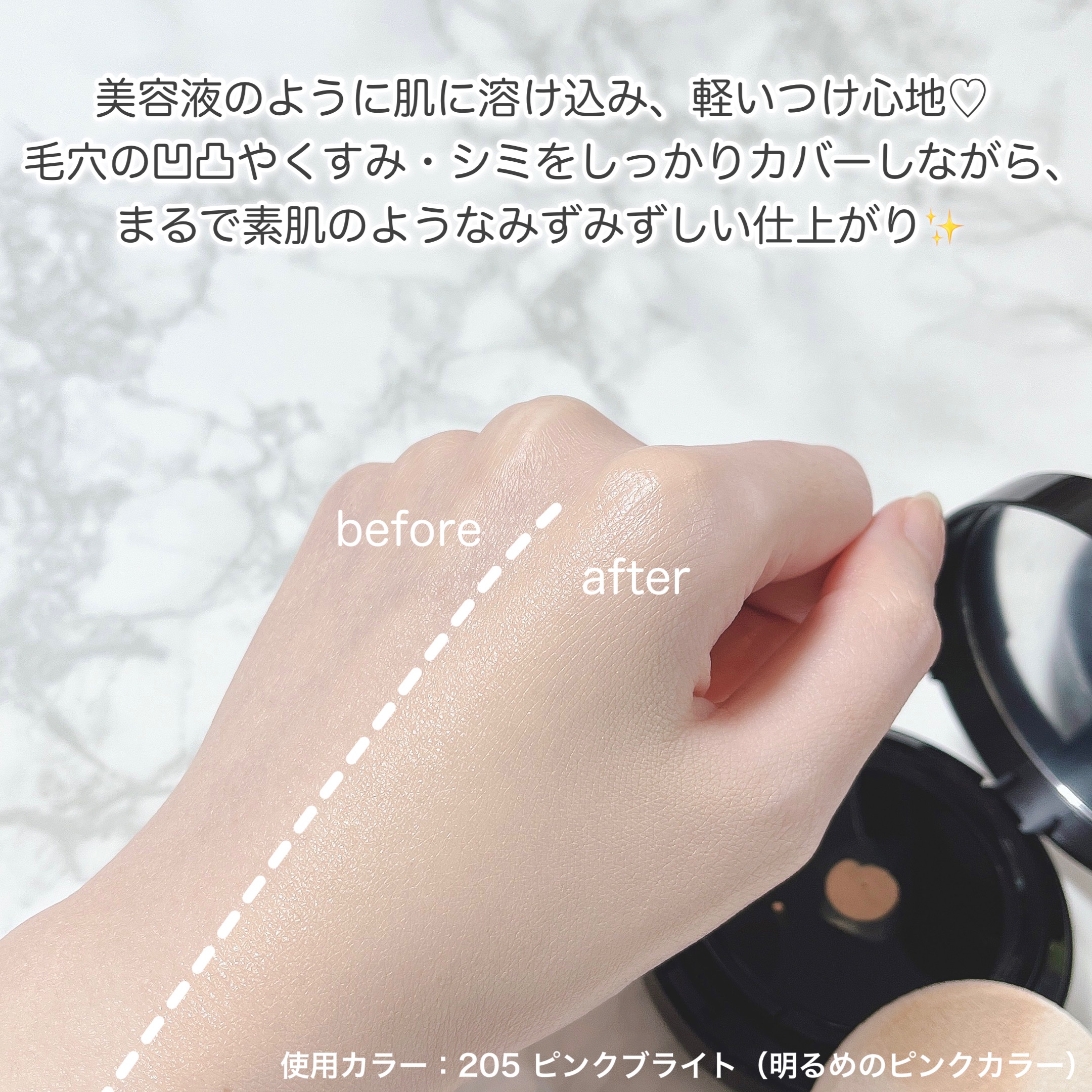 - <101 アイボリー> 水、シラカンバ樹液、ホホバエステル、BG、ペンチレングリコール、マカデミアナッツ脂肪酸フィトステリル、ソルビトール、ポリリシノレイン酸ポリグリセリル-6、塩化Na、マイカ、スクワラン、フウチョウソウ葉エキス、ツボクサエキス、ヨモギ葉エキス、イタドリ根エキス、オウゴン根エキス、カンゾウ根エキス、チャ葉エキス、カミツレ花エキス、ローズマリー葉エキス、セイヨウハッカ葉エキス、アルニカ花エキス、アーチチョーク葉エキス、ニオイテンジクアオイ油、ビターオレンジ花油、イソステアリン酸ポリグリセリル-2、ジミリスチン酸Al、プロパンジオール、トコフェロール、酸化チタン、酸化鉄、水酸化Al <102 ニュートラル> 水、シラカンバ樹液、ホホバエステル、BG、ペンチレングリコール、マカデミアナッツ脂肪酸フィトステリル、ソルビトール、ポリリシノレイン酸ポリグリセリル-6、塩化Na、マイカ、スクワラン、フウチョウソウ葉エキス、ツボクサエキス、ヨモギ葉エキス、イタドリ根エキス、オウゴン根エキス、カンゾウ根エキス、チャ葉エキス、カミツレ花エキス、ローズマリー葉エキス、セイヨウハッカ葉エキス、アルニカ花エキス、アーチチョーク葉エキス、ニオイテンジクアオイ油、ビターオレンジ花油、イソステアリン酸ポリグリセリル-2、ジミリスチン酸Al、プロパンジオール、トコフェロール、酸化チタン、酸化鉄、水酸化Al <103 ベージュ> 水、シラカンバ樹液、ホホバエステル、BG、ペンチレングリコール、マカデミアナッツ脂肪酸フィトステリル、ソルビトール、ポリリシノレイン酸ポリグリセリル-6、塩化Na、マイカ、スクワラン、フウチョウソウ葉エキス、ツボクサエキス、ヨモギ葉エキス、イタドリ根エキス、オウゴン根エキス、カンゾウ根エキス、チャ葉エキス、カミツレ花エキス、ローズマリー葉エキス、セイヨウハッカ葉エキス、アルニカ花エキス、アーチチョーク葉エキス、ニオイテンジクアオイ油、ビターオレンジ花油、イソステアリン酸ポリグリセリル-2、ジミリスチン酸Al、プロパンジオール、トコフェロール、酸化チタン、酸化鉄、水酸化Al <104 オークル> 水、シラカンバ樹液、ホホバエステル、BG、ペンチレングリコール、マカデミアナッツ脂肪酸フィトステリル、ソルビトール、ポリリシノレイン酸ポリグリセリル-6、塩化Na、マイカ、スクワラン、フウチョウソウ葉エキス、ツボクサエキス、ヨモギ葉エキス、イタドリ根エキス、オウゴン根エキス、カンゾウ根エキス、チャ葉エキス、カミツレ花エキス、ローズマリー葉エキス、セイヨウハッカ葉エキス、アルニカ花エキス、アーチチョーク葉エキス、ニオイテンジクアオイ油、ビターオレンジ花油、イソステアリン酸ポリグリセリル-2、ジミリスチン酸Al、プロパンジオール、トコフェロール、酸化チタン、酸化鉄、水酸化Al <205 ピンクブライト> 水、シラカンバ樹液、ホホバエステル、BG、ペンチレングリコール、マカデミアナッツ脂肪酸フィトステリル、ソルビトール、ポリリシノレイン酸ポリグリセリル-6、塩化Na、マイカ、スクワラン、フウチョウソウ葉エキス、ツボクサエキス、ヨモギ葉エキス、イタドリ根エキス、オウゴン根エキス、カンゾウ根エキス、チャ葉エキス、カミツレ花エキス、ローズマリー葉エキス、セイヨウハッカ葉エキス、アルニカ花エキス、アーチチョーク葉エキス、ニオイテンジクアオイ油、ビターオレンジ花油、イソステアリン酸ポリグリセリル-2、ジミリスチン酸Al、プロパンジオール、トコフェロール、酸化チタン、酸化鉄、水酸化Al