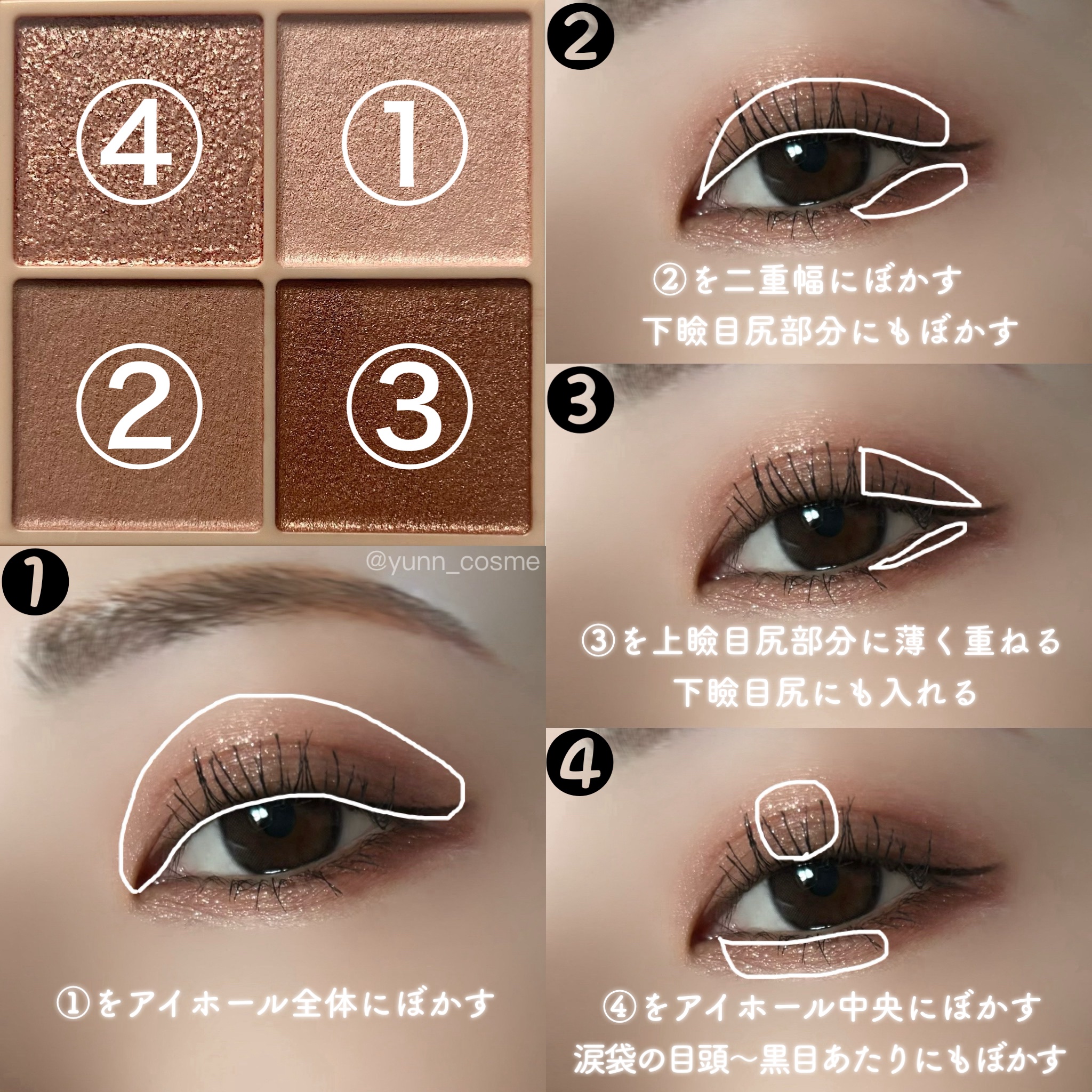 - ラメ・パール・マット3質感の4色アイシャドウ。 肌馴染みの良いベージュを基調としたカラー。ラメ・パール・マットの3質感を重ねて、自然にまぶたを強調し奥行のある大きな目元へ。 しっとり溶け込むような柔らかなパウダーなので、スルスル伸びてまぶたにピタッと密着。保湿成分(スクワラン・ホホバ種子油)配合。