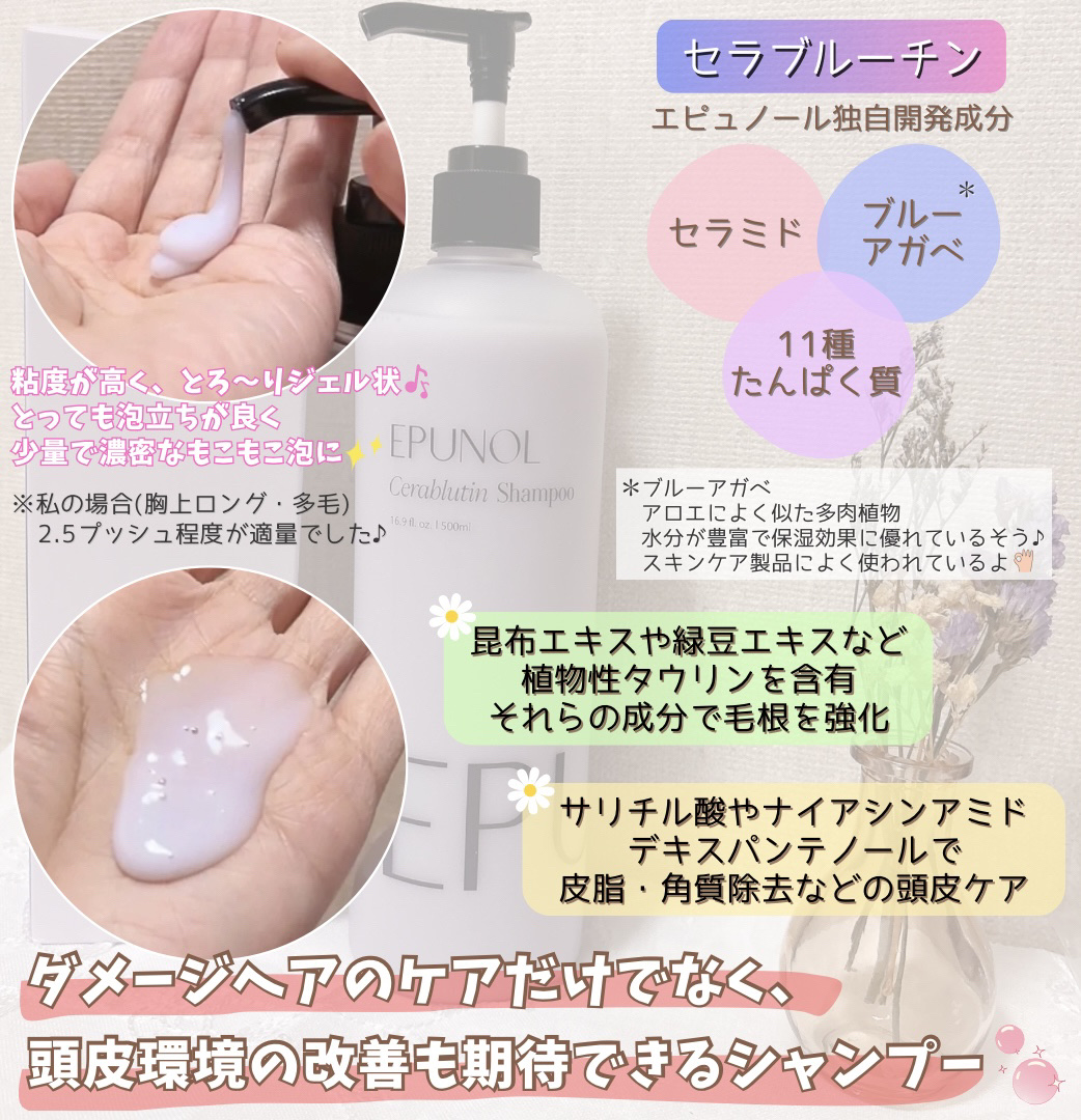 - エピュノール独自補修成分であるセラブルーチンでダメージヘアーを集中ケアし独自のハリコシ成分でヘアボリュームをふんわりと仕上げるシャンプー。
