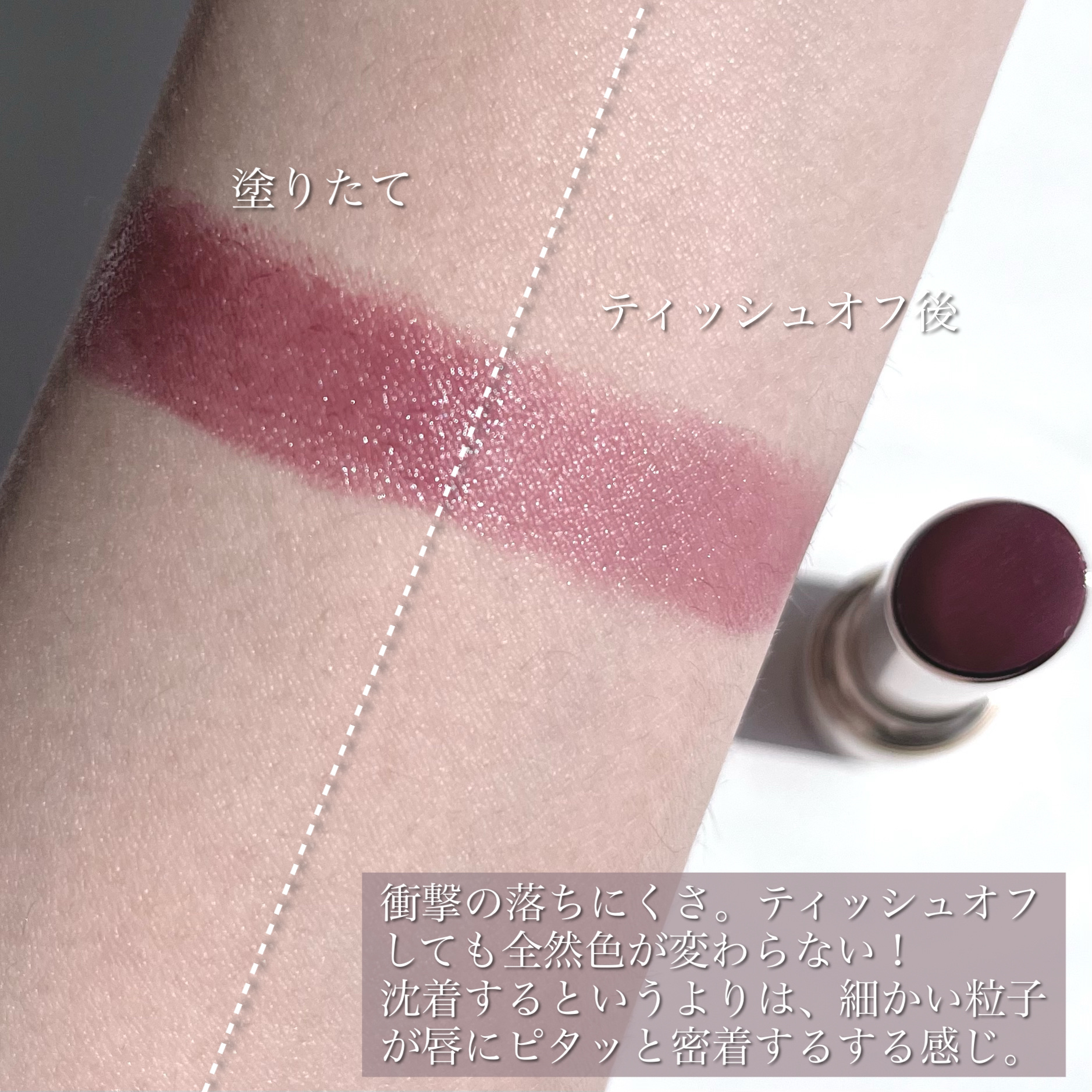 ラスボスは紅折り紙よりも明るく、くすみ弱めの青みレッド。 誓いのルビーは逆に紅折り紙よりもかなり暗くボルドー寄り。 チェリーの自惚れは色味がいちばん紅折り紙と近いかも。しかし質感が全く違うので印象がかなり変わります🥺 リップモンスターはツヤツヤ透け感のある仕上がりの一方、ネンマクフェイクルージュはツヤ感が弱いもののしっとりしっかり染め上げてくれるイメージ。 どちらかというとマット寄りのチェリーの自惚れの方が落ち着いて見えるかもしれません。 ティッシュオフしてみると、青み深みが残る誓いのルビーがいちばん似た色になるという結果に!誓いのルビーの方がかなり深くはあります。 ラスボスはやや明るくニュートラルに、チェリーの自惚れは赤というよりはピンク系になりました。