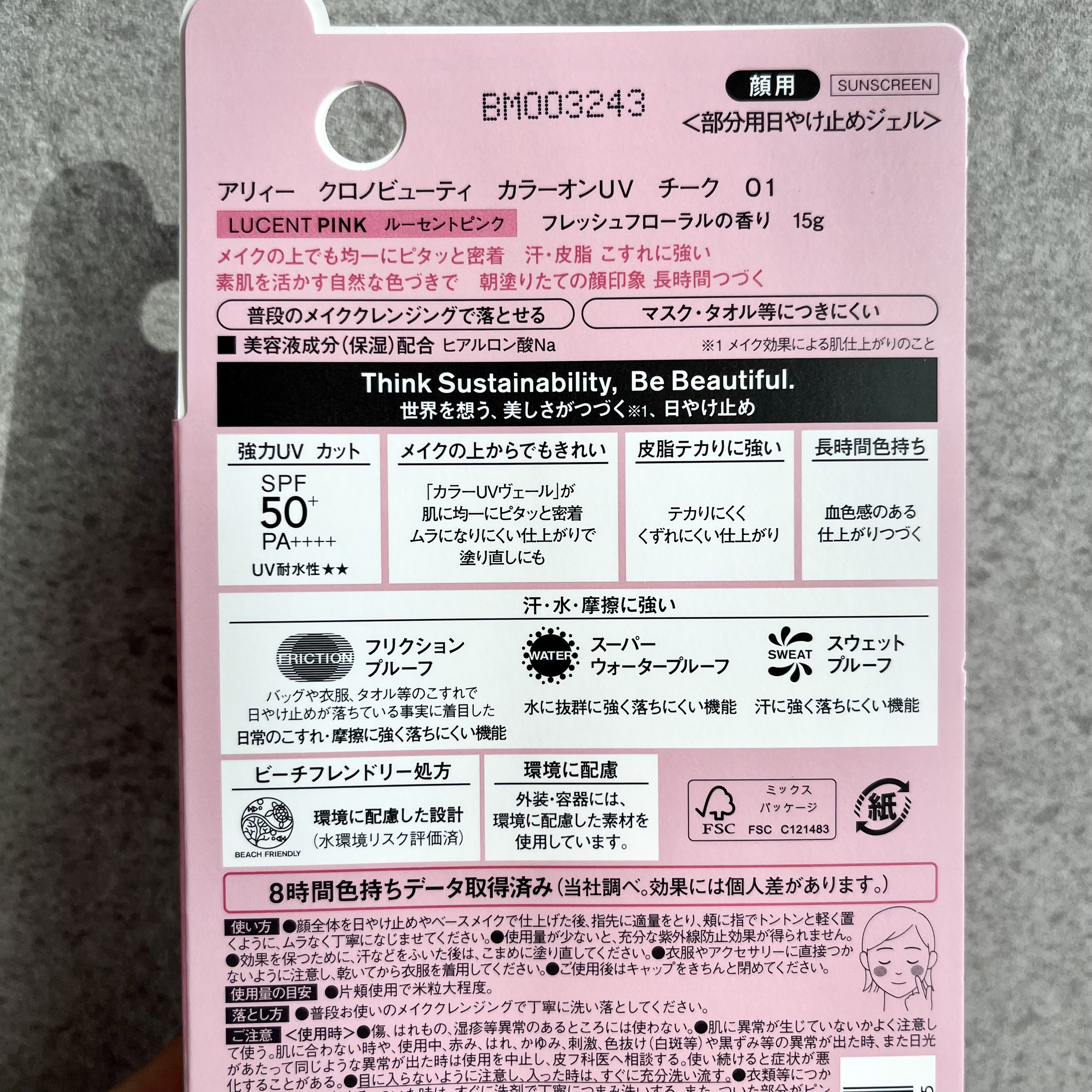 - ◆紫外線を浴びやすい、頬に使えるチークUV/鼻・頬に使える追いツヤUV ◆メイクの上から塗り直しとしても使える。 ◆汗・皮脂 マスクやタオルなどのこすれにも強く落ちにくい。 ◆「カラーUVヴェール技術」で、ベースメイクと混ざりにくく均一に密着。 SPF50+と感触の良さはそのままに素肌を活かした自然な色づきを両立! ◆8時間色持ち データ取得済み ※アリィー調べ。効果には個人差があります。 <基本情報> ・強力UV カット(SPF50+・PA++++) ・フリクションプルーフ:タオルやマスク等のこすれにも強く、落ちにくい ・スーパーウォータープルーフ:汗・水に抜群※²に強い機能 ※² アリィー商品内において LUCENT PINK(チーク 01) 自然に色づき血色感仕上がりの‟透け感ピンク” パッケージもピンクで、ポーチの中も華やぐメイクアイテムです WARM ORANGE(チーク 02) ヘルシーな血色感仕上げの‟じんわりオレンジ” じんわ~りと血色感を与えてくれるから、素肌を活かした自然な仕上がりに TRANSLUCENT(ラスター) ツヤ感を演出する‟シマーカラー” 鼻や頬にハイライトとして使うことで長時間ツヤが持続します