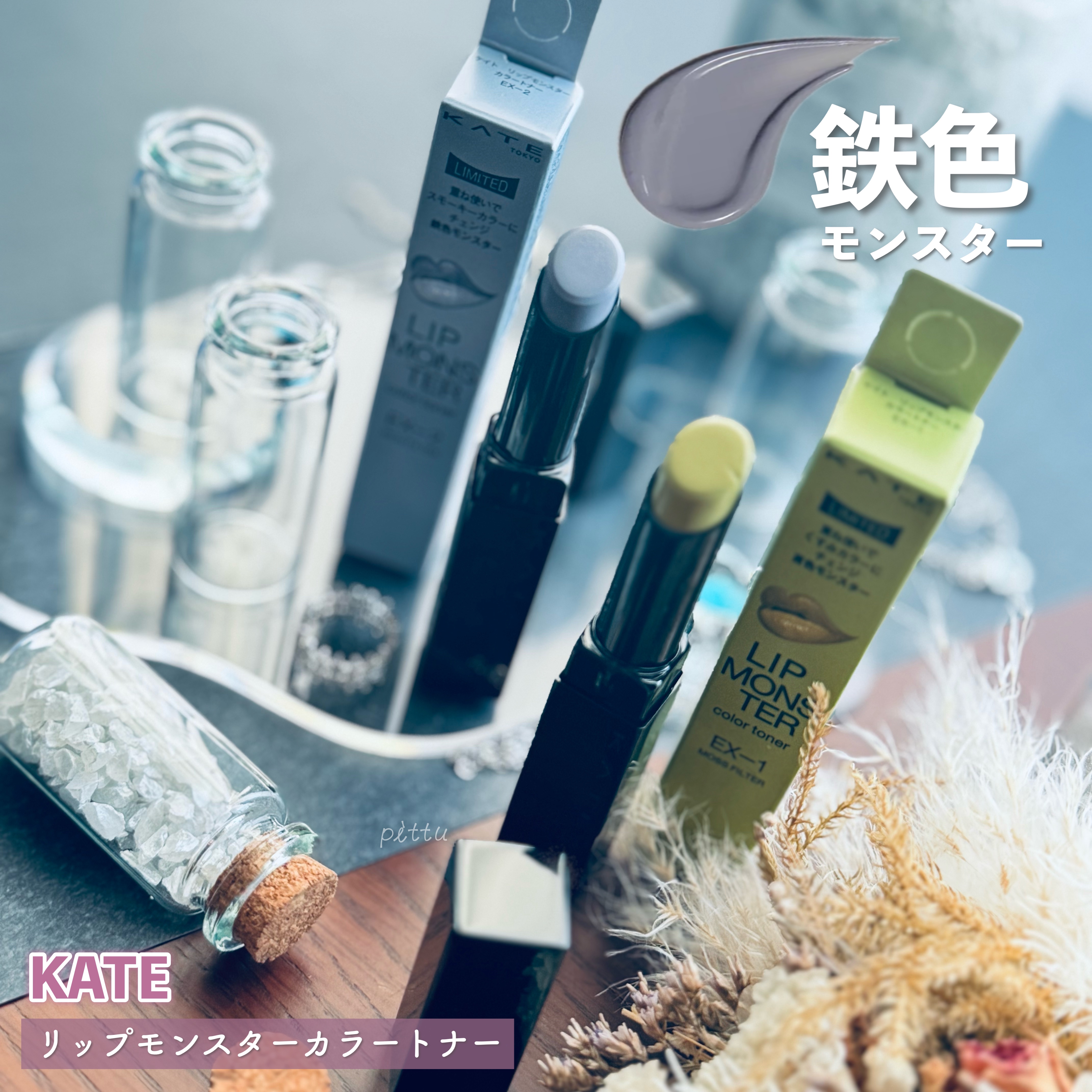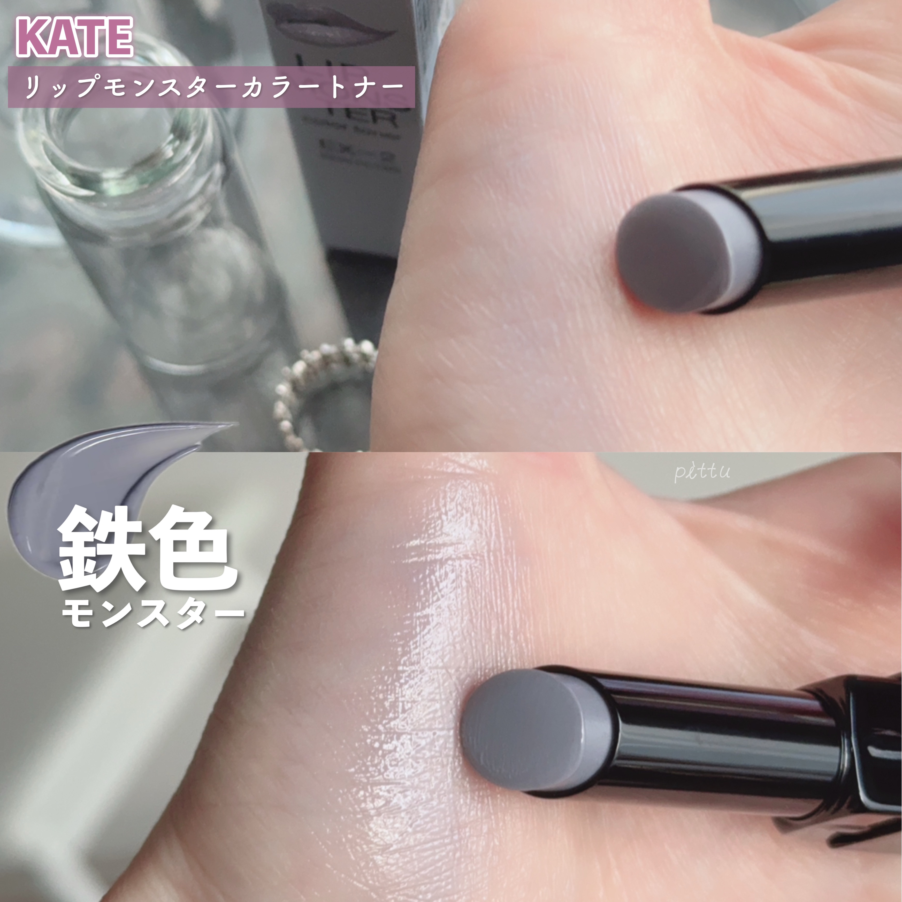 KATEリップモンスターカラートナーEX-2鉄色モンスター口紅の上から重ねて色変化長時間色持続する苔色モンスターと鉄色モンスター独自の色持ち技術で重ねるとモンスター化して落ちにくいリップ鉄色モンスターライトグレーのリップ上地でダークなスモーキ...