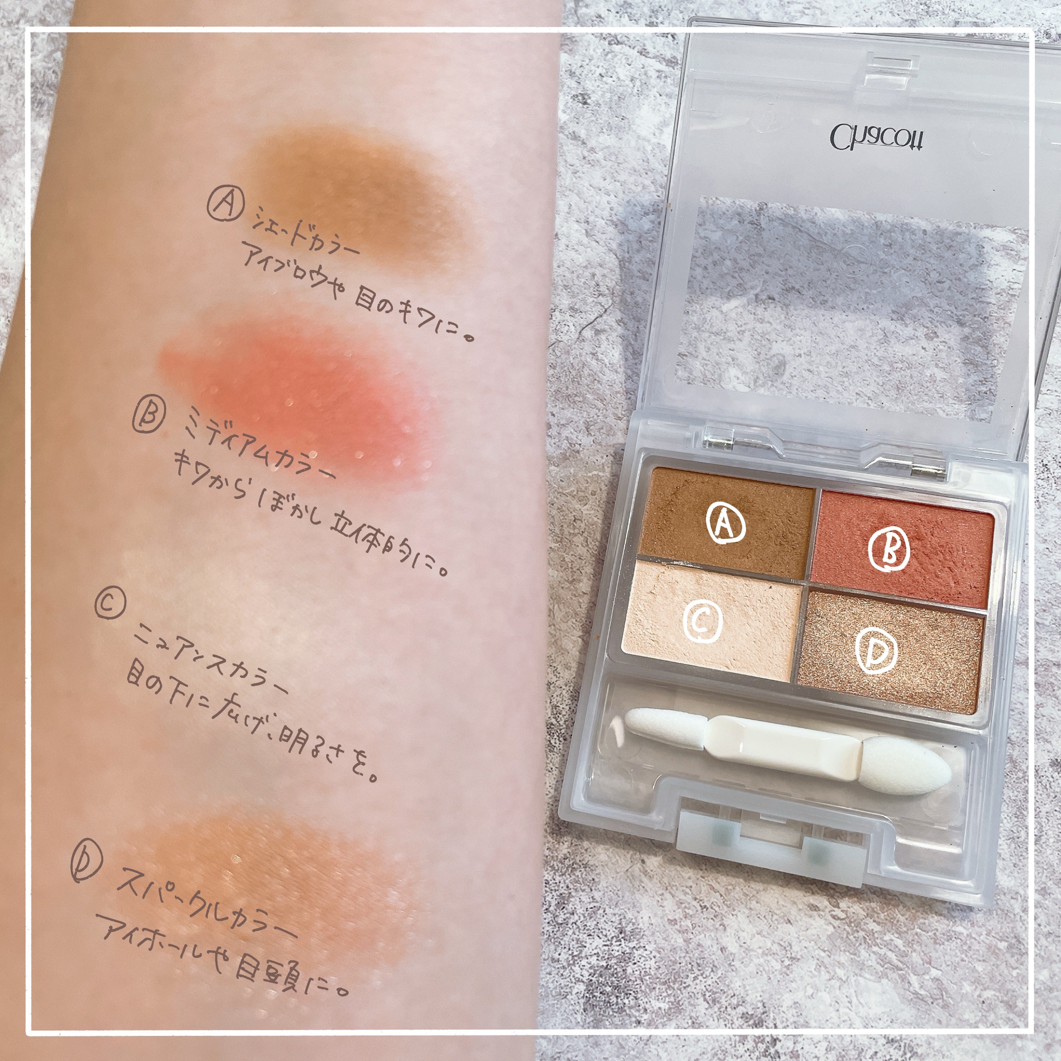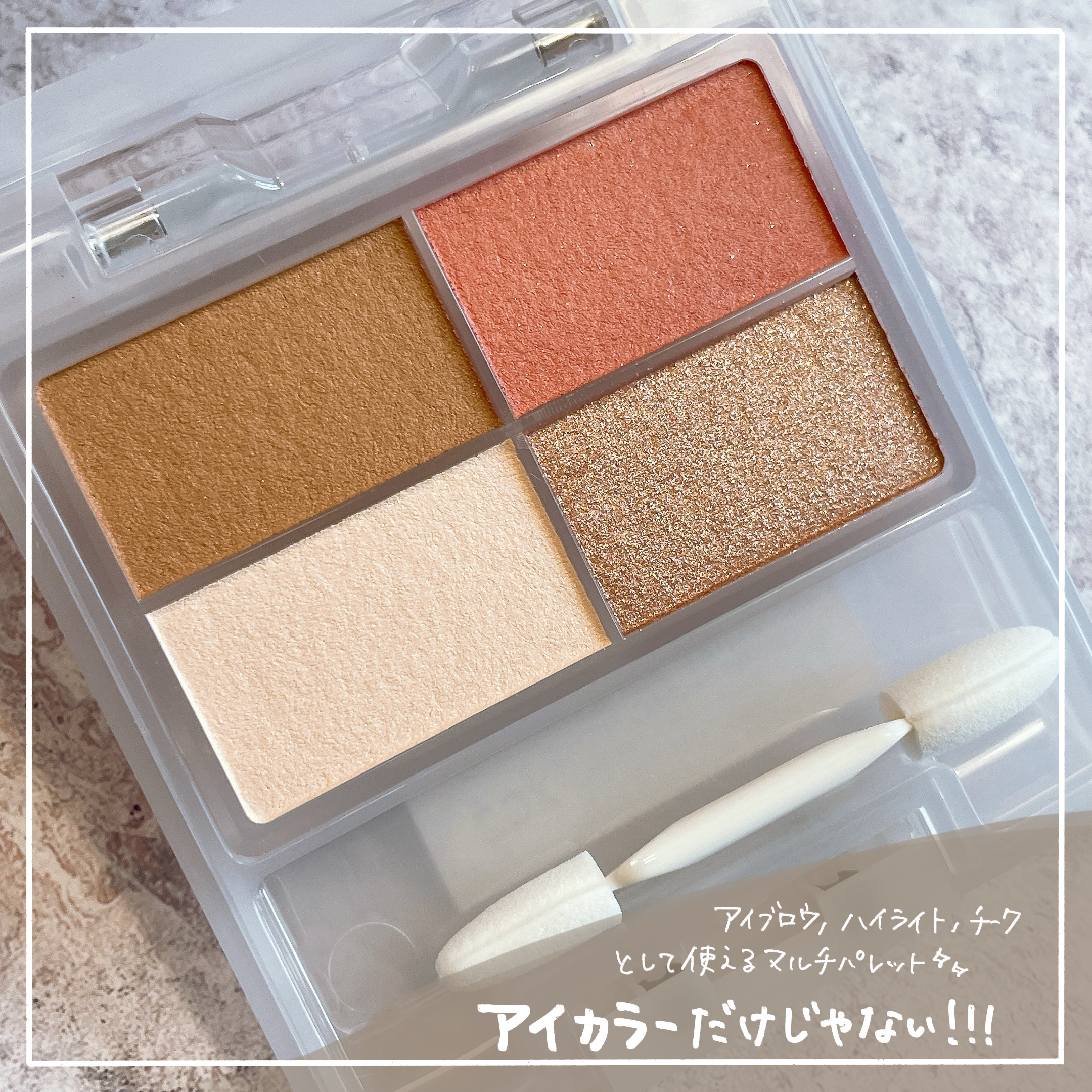 - シェードカラー・ミディアムカラー・ニュアンスカラー・スパークルカラーの4色が1つにまとまったメイクパレットです。 アイシャドウだけでなく、アイブロウやシェーディングとしても使えるカラーが入っているので、眉から目元まで、パレット1つでアイメイクが完成します。 カラーの組み合わせ次第でアレンジが広がり、様々なシーンに合わせたアイメイクを自在に楽しめます。 高密度ウレタン素材のチップ付きです。