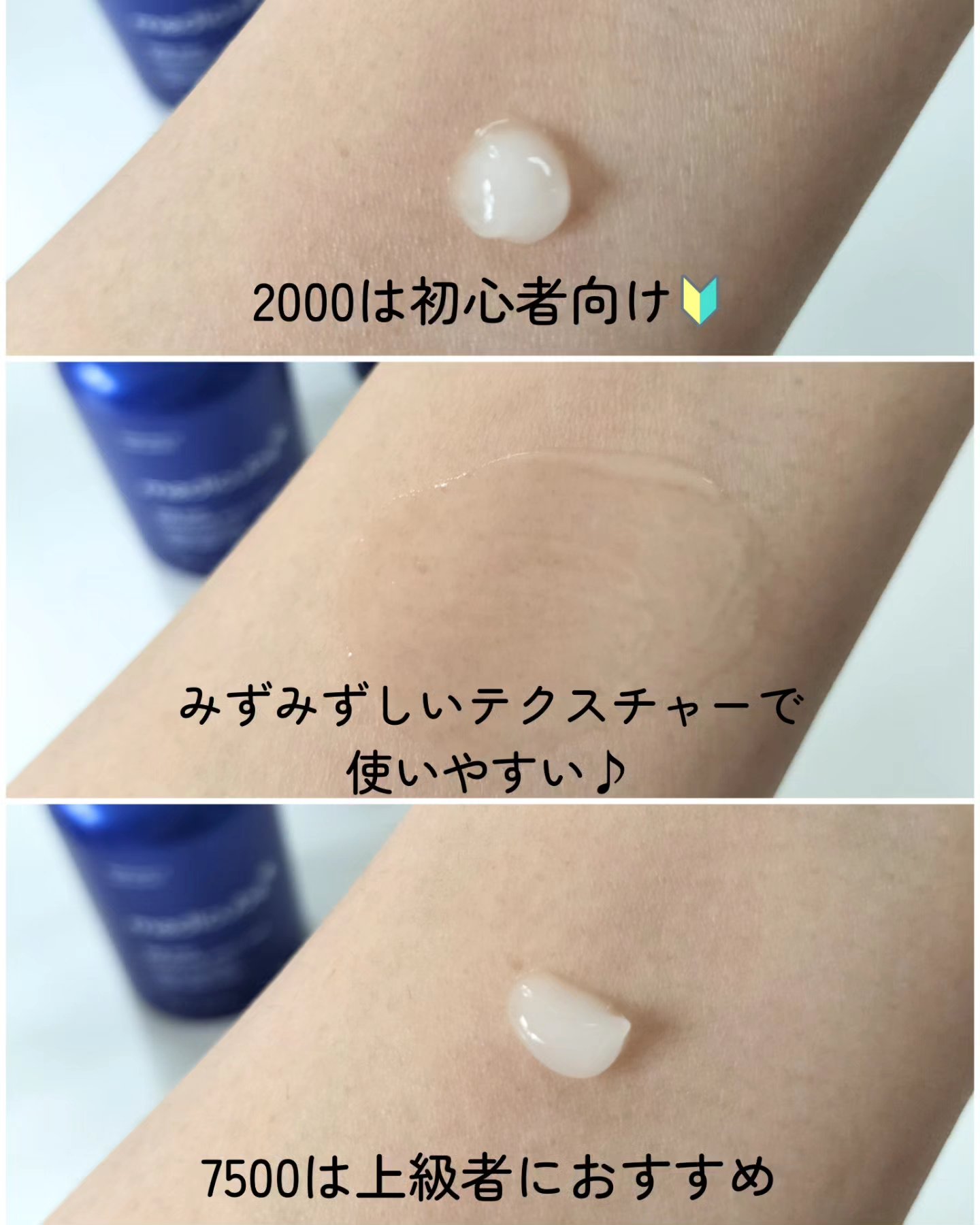 2000と7500、どちらもジェルのようなみずみずしいテクスチャー。 数字の大きさに恐る恐る使ってみたのですが、意外とチクチク感は強くないと思いました。 毛穴よりも13倍小さい16μmというサイズで、エステ専門ケア並みの効果が得られるそう。 水分クリームと一緒に使っているのですが、肌がもちっとして相性がいいみたいです。