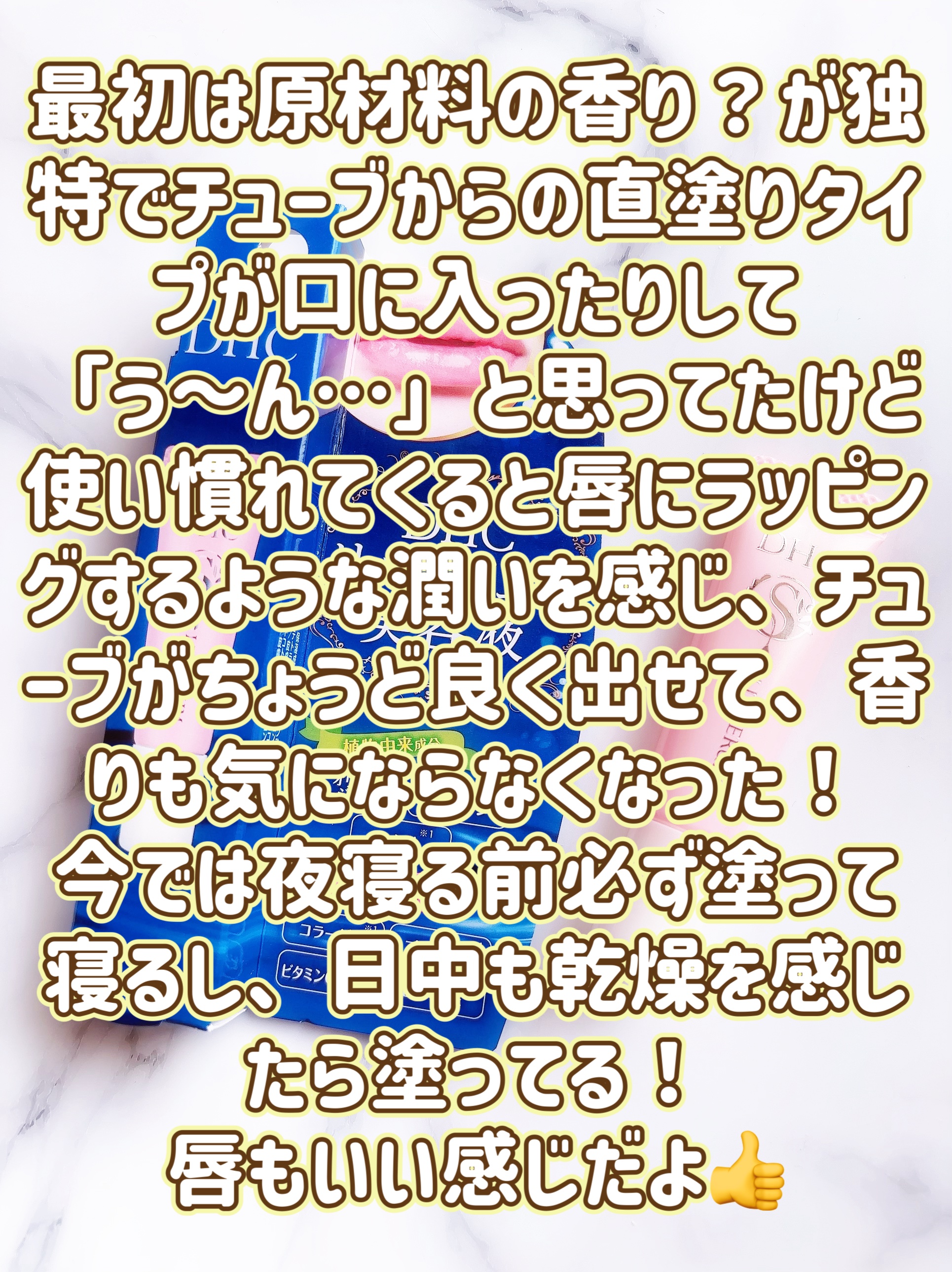 軽い使用感でありながら、とろりとしたテクスチャーのジェル状美容液。保湿・保護作用に優れたオリーブバージンオイルやスクワラン、ヤシ油を配合。うるおいヴェールで包み込み、乾燥によるカサつきを防ぎます。 リップグロスのようにスルスル滑らかに塗れ、塗った直後はややテカテカするものの時間が経っても保湿効果がしっかり残り艶々なふっくら柔らかな唇になります。軽い付け心地でベタベタしません。 先端が斜めカットになっており、唇にフィットし塗りやすい。透明で色素沈着しない。朝昼夜と一日中使用できるリップ美容液。ドンキなどのディスカウントストアやドラッグストアにもあるので購入しやすい。ディスカウントストアだと半額以下で買えたりするという口コミもネットにありました。 やや独特なにおいはありますが私は気にならない程度です。 近場で購入しやすいものをお探しの方。一日中使えるものをお探しの方。付け心地の軽いものがお好きな方。唇が荒れやすい方。手軽にリップケアをしたい方。