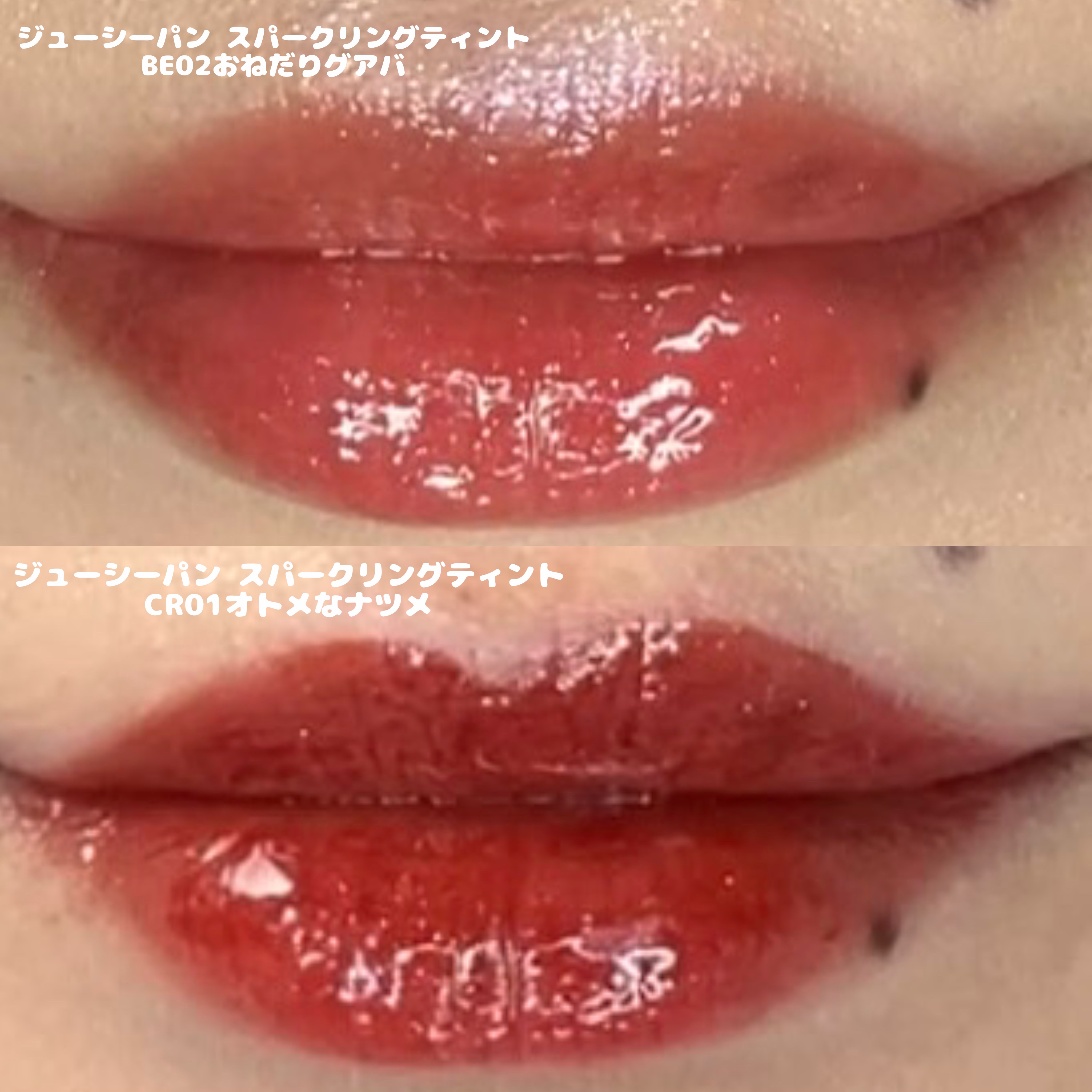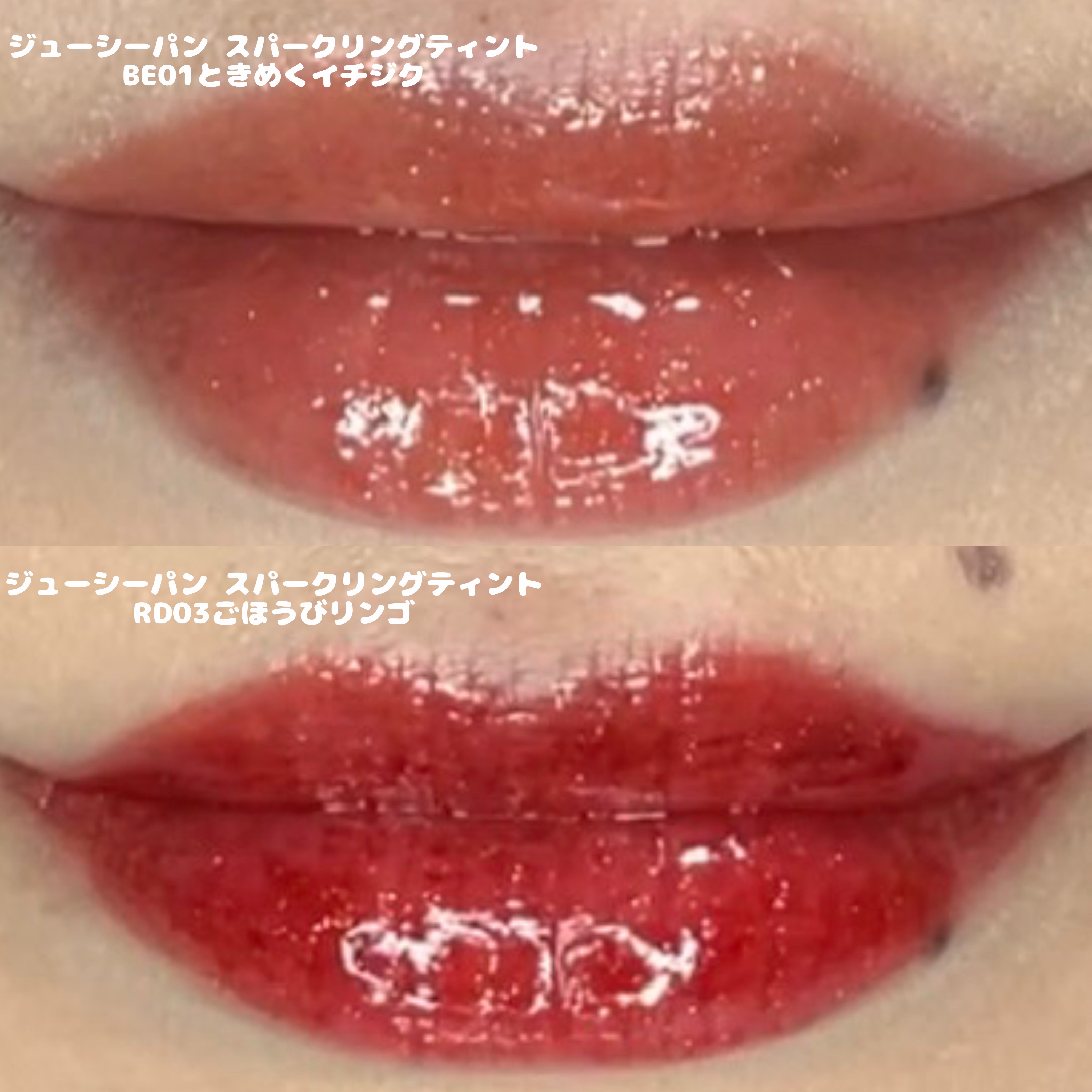 ラメがめちゃくちゃ可愛いA’pieuのジューシーパン スパークリングティント。BE01のときめくイチジクはベースがベージュ系のナチュラルカラーでゴールドやホワイト系のラメが入っています! 普段から濃いめのリップが好きな方は物足りないと感じると思うので、こちらを全体的に塗った上に内側に濃いめのリップ塗ってもとても可愛く仕上がります🫶🏻 ティント効果もあって、ティッシュオフするとツヤ感は失われるものの色とラメはしっかり残ります!