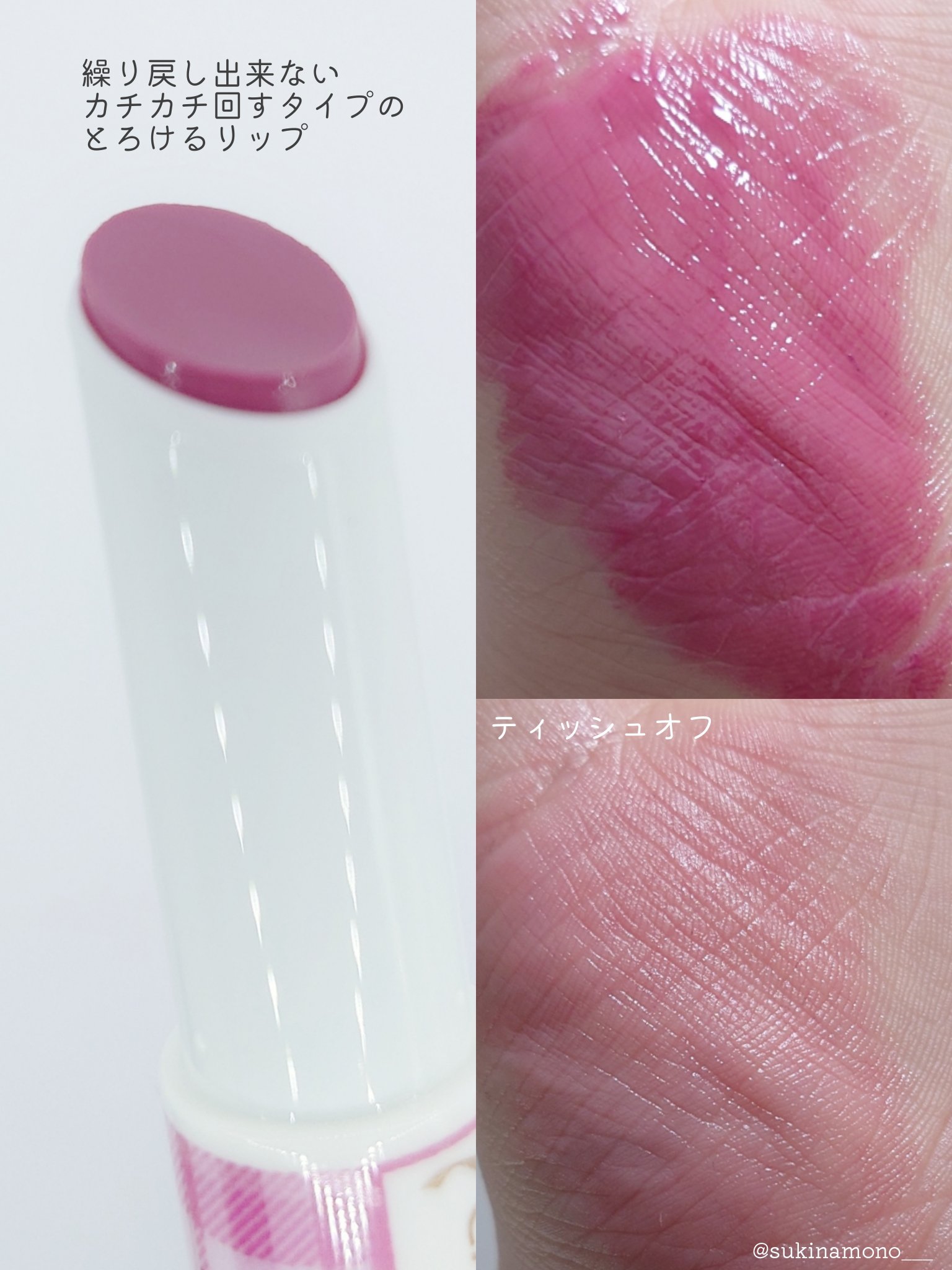 - とろけて潤うむっちりぷるぷる唇に! その名の通り、むっちりとしたボリューム感とぷるぷるツヤツヤな魅力的な唇に仕上がるティントリップです。 Point1【むっちりぷるぷる唇】 ・プランパー効果で縦じわカバー&ボリューム感のあるむっちり唇に ※メイクアップ効果による ・スーッとした清涼感のある使い心地 Point2【ちゅるんとしたツヤティント】 ・シロップのようなちゅるんとしたツヤが持続 ・塗った時の色が長持ちするティント処方 唇の上でとろけるメルティングオイルを配合しています。 するすると抵抗感がなく、なめらかな塗り心地で、重ね塗りをしてもムラなくきれいに仕上がります。 6種の美容保湿成分配合。リップクリームいらずで潤いが持続します。 ≪ワセリン・ヒアルロン酸・コラーゲン・アルガンオイル・ハチミツ・シアバター≫ 無香料 ・清涼感のある使い心地です。 ・大変やわらかい中身ですので、1㎜程度くり出して、ゆっくりやさしく塗布してください。 ・一度繰り出した中身は戻りませんので、出し過ぎにご注意ください。