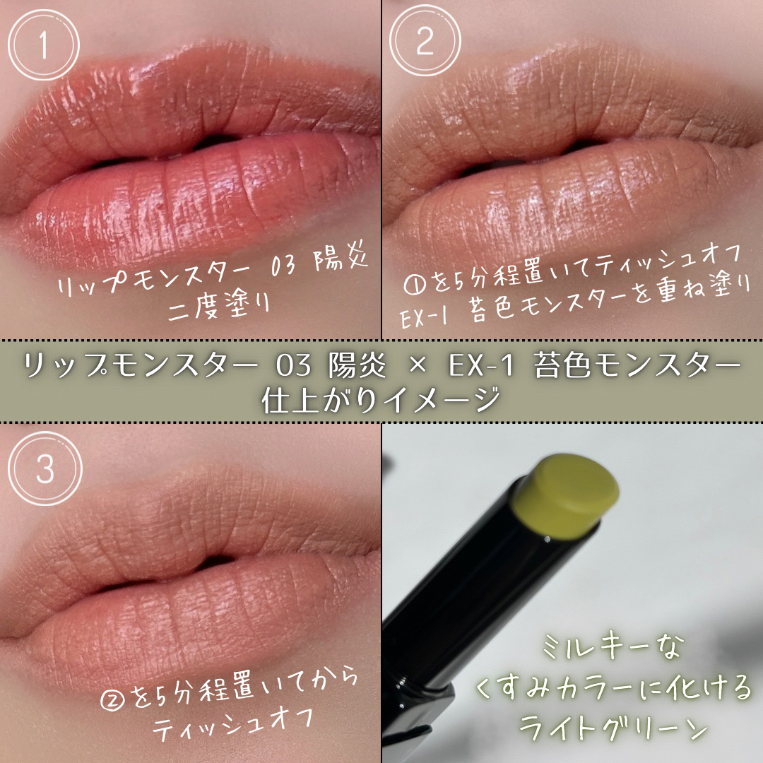 - 【数量限定発売】 口紅の上から重ねて色変化 長時間色持続する闇色モンスター。 当社独自の色持ち技術で、重ねるとモンスター化して落ちにくいリップへ! ■EX-1 苔色モンスター ライトグリーンのリップ上地で、ミルキーなくすみカラーへチェンジ。 ■EX-2 鉄色モンスター ライトグレーのリップ上地で、ダークなスモーキーカラーへチェンジ。 ■EX-3 闇色モンスター クリアブラックのリップ上地で、ダークな深みカラーへチェンジ。