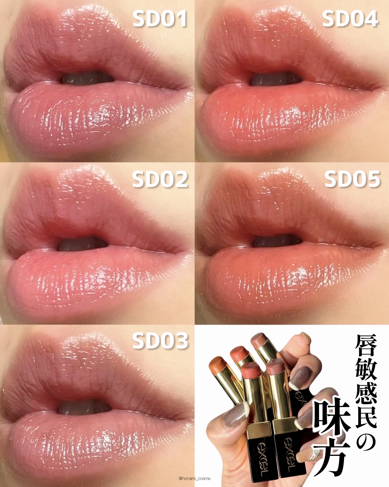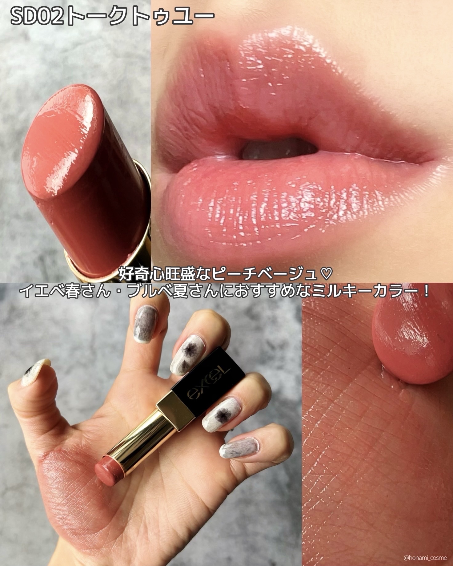- 永遠に変わらない魅力を秘めたベージュだけを厳選した、極上ニュアンスカラーの美容液リップです。 とろけるようなテクスチャー、絶妙な色味、プランプ効果*1のすべてを叶える絶妙なバランスを追求し、発売まで2年を要したこだわりのアイテムです。 どんなシチュエーションにも合わせられ、素の唇の美しさを引き立てる極上ベージュカラー。 どなたでも似合う“運命の1本”が見つかるニュアンスカラーラインアップです。 程よいシアーな発色で唇の血色感も残しつつ、ベージュの中に赤みを数滴混ぜたような絶妙カラーだけを厳選しました。 プランプ効果*1でふっくら艶めく唇を演出し、ひと塗りで気になる乾燥を予防し唇の縦じわをカバーします*1。 唇の上にとろけるようなオイル膜を形成し、ぴたっと密着してヨレを防ぎます。 美容液97%*2のトリートメント感覚リップです。 *1 メイクアップ効果による *2 仕上がり効果粉末を除く成分 4月9日よりエクセル公式オンラインショップ及び amazon にて先行販売