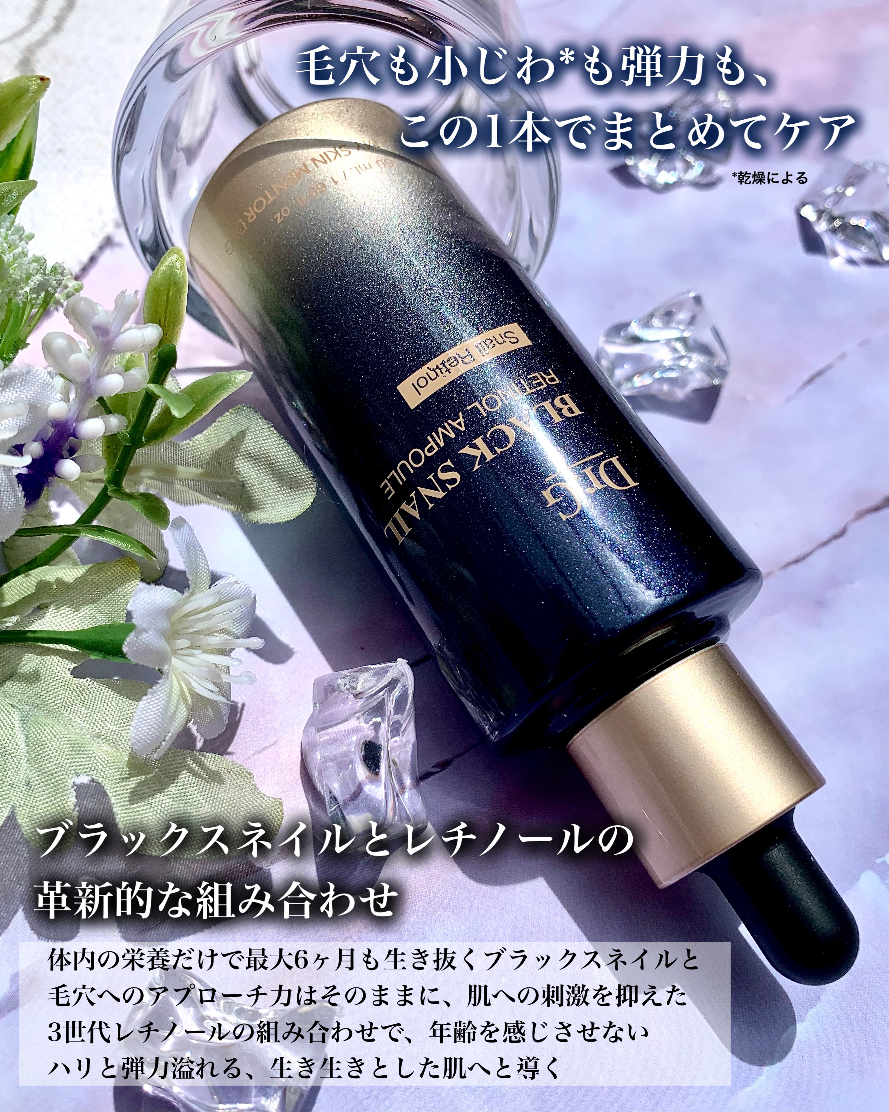 ブラックスネイルと低刺激のレチノールを配合した美容液 とろみがあってミルキーなテクスチャー なめらかにすべるように伸びて気持ちいい使用感で好き ブラックスネイル20%配合クリーム もっちりとした弾力を感じるテクスチャー なめらかに伸びてべたつかない Dr.Gが開発した独自成分のブラックスネイルレチノールは刺激が少なく効果的◎ アトピーもちの敏感肌、乾燥肌だけどトラブルなく使えてるよ♪