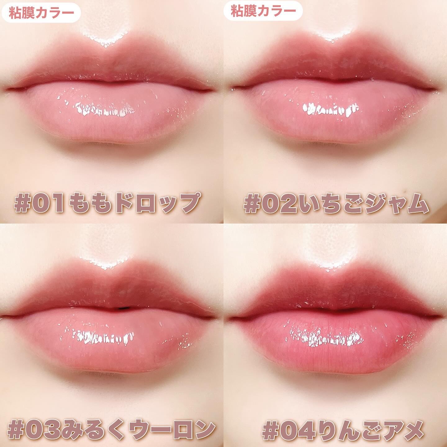 - 保湿成分たっぷりで、うるうるのぽってり唇*1を長時間演出。 透け感×馴染みのいいカラーで、いつものリップに潤いとあざとさをプラス! ノールックで塗り直しできるので、学校やお仕事の日にもオススメ。 01 ももドロップ ももドロップはドロップのような透け感と低彩度のももピンクで一番*2ナチュラルなカラー。 赤ちゃんのように自然な血色感で、白湯メイクにオススメ。 02 いちごジャム いちごジャムはジャムのようなぷるぷる感と、キュートな少女ピンクの定番カラー。 甘くてカワイイ雰囲気をまといたい日や、純欲メイクにオススメ。 03 みるくウーロン みるくウーロンはクリーミーなベージュウーロンカラーで一番*2なじみのいい粘膜つやカラー。 ちょっと血色を足したいすっぴんメイクや、スクールメイク、お仕事メイクにオススメ。 04 りんごアメ りんごアメは完熟りんごアメのようなちゅるちゅる火照りレッドカラー。 ぽってりリップで色気を出したい日や、ベースリップの発色が物足りない時にも。 *1メイク効果 *2ブランド内において