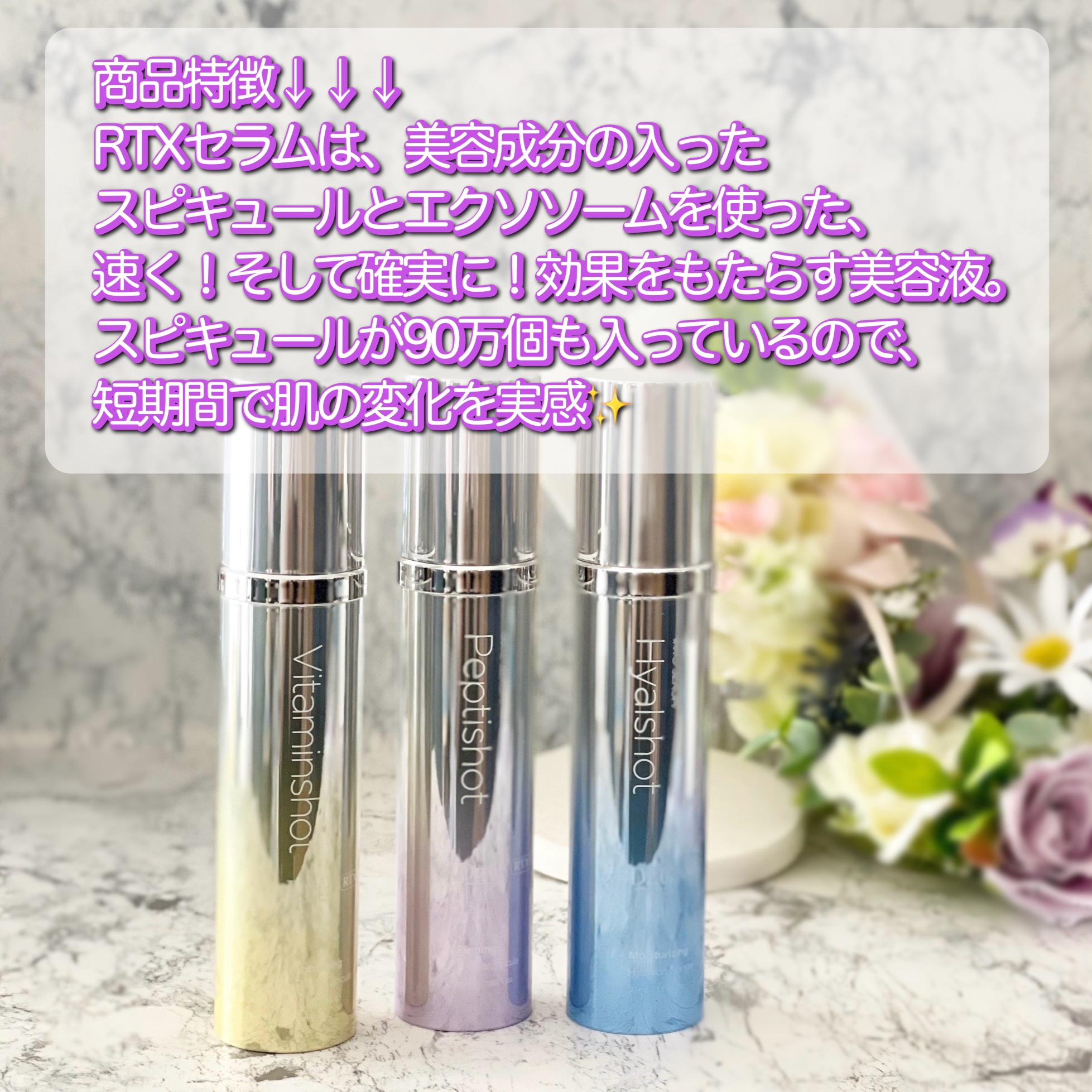 - RTXラインは、10年ぶりに復活した、専門家のノウハウを凝縮させたラインです。 近年、”美容施術”や”美容皮膚科”への関心が高まり、併せて、”セルフでも高いレベルのケア”を求める方や成分について興味を持つ方も増加傾向にあります。 そこで開発されたのがRTXセラムです。 RTXセラムは、美容保湿成分の入ったスピキュール*とエクソソーム*を使ったこだわりの美容液です。 スピキュール*が90万個も入っています。 Dr.Gのスピキュールは、スピキュールそのものに美容保湿成分が入っている第3世代スピキュールです。 肌(角質層)に浸透したあとに、コーティングされた美容液が弾けて一気に満たします。さらに、毛穴より2600倍も小さい美容保湿成分を含んだエクソソーム*で隅々まで浸透させます。 Dr.Gのスピキュール*は中が空洞になっている、ストローのような形をしている、純度100%のエアロショットです。 3種類の美容液があり、それぞれ、ツヤケア効果、水分ケア効果、ハリ弾力ケアをもたらします。 ツヤ透明感肌の演出 ビタミンC*スピキュールで肌の角質層から輝くような素肌に整え、ナイアシンアミド* とビタミンEエクソソーム*で乾燥くすみケアをします。 *整肌成分