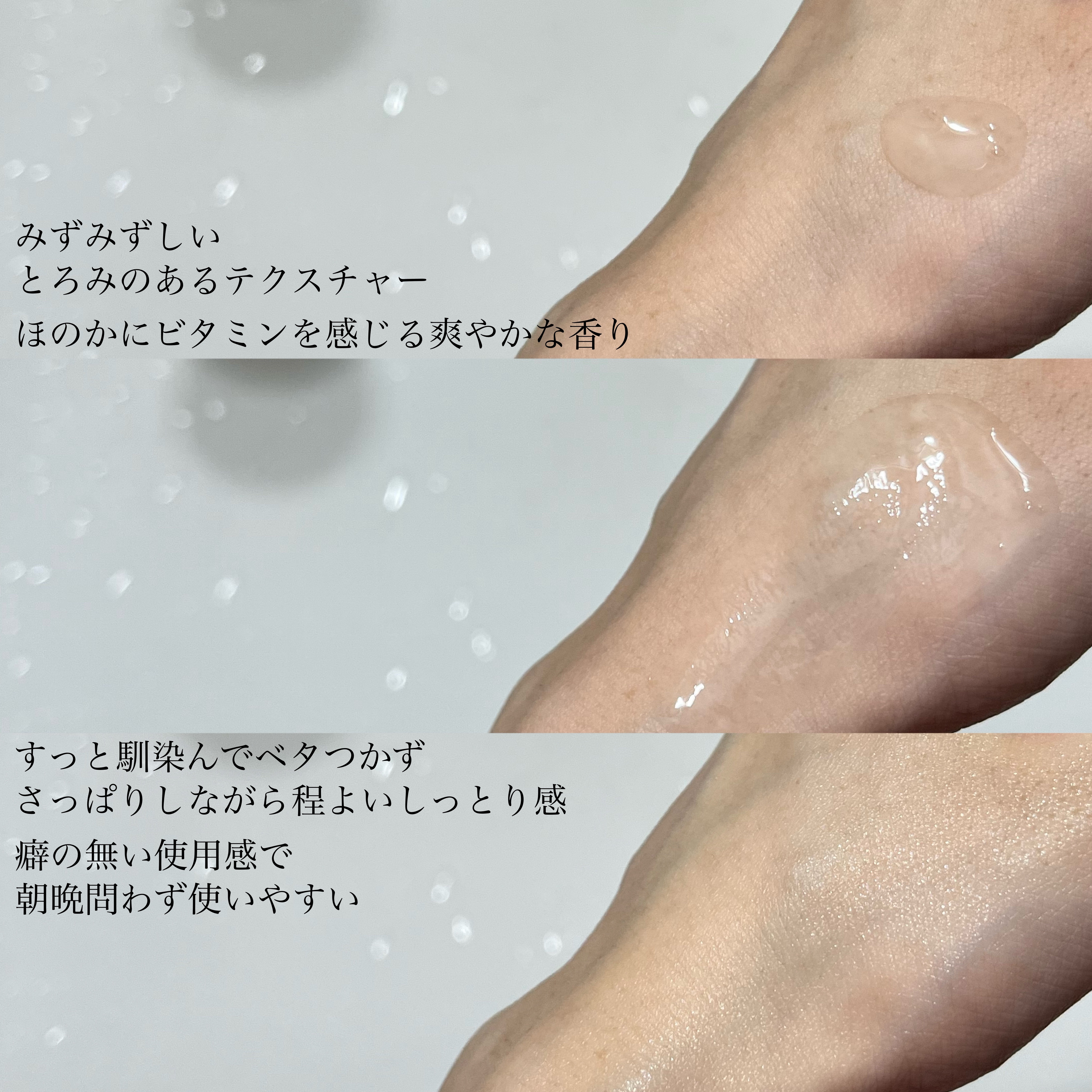 | とろみがあるけどサラッとした使用感でスーッとお肌になじむよ。 | 詳細を見る | ||