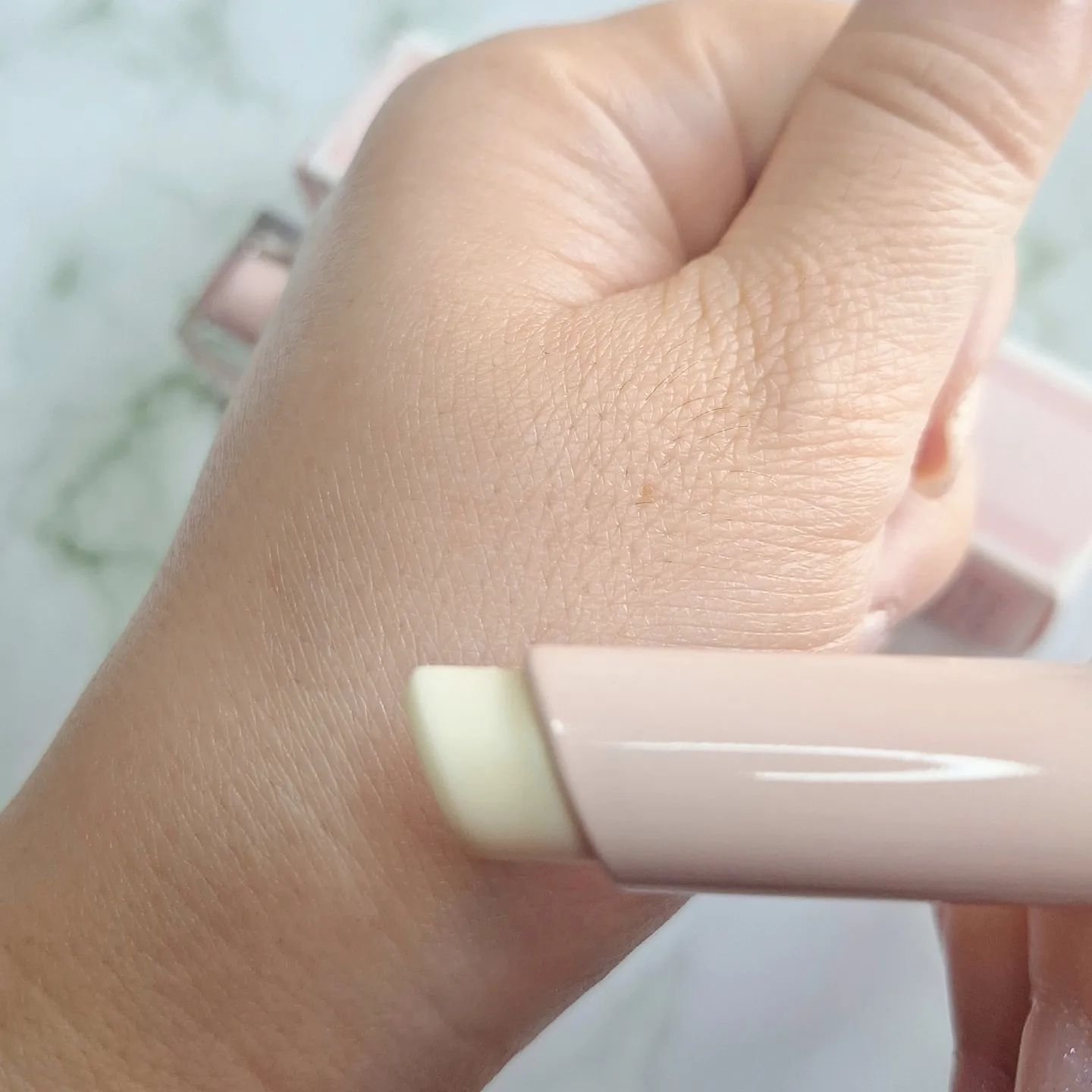 硬めのテクスチャーでチューブを強く押さないと出てきません🤣笑 米粒1粒程度という極小量で、両目の上下まぶたが十分に塗れます❗ 色は少し白っぽいですが気になるほどでもなく、ウォータープルーフ処方ですが夕方になっても乾燥せず、持ちも良かったです👍❤️ 二重幅にアイシャドウが溜まることもなかったです‼ 550円って考えたら破格😳 かなり能力の高いアイシャドウベースだと思います🧡