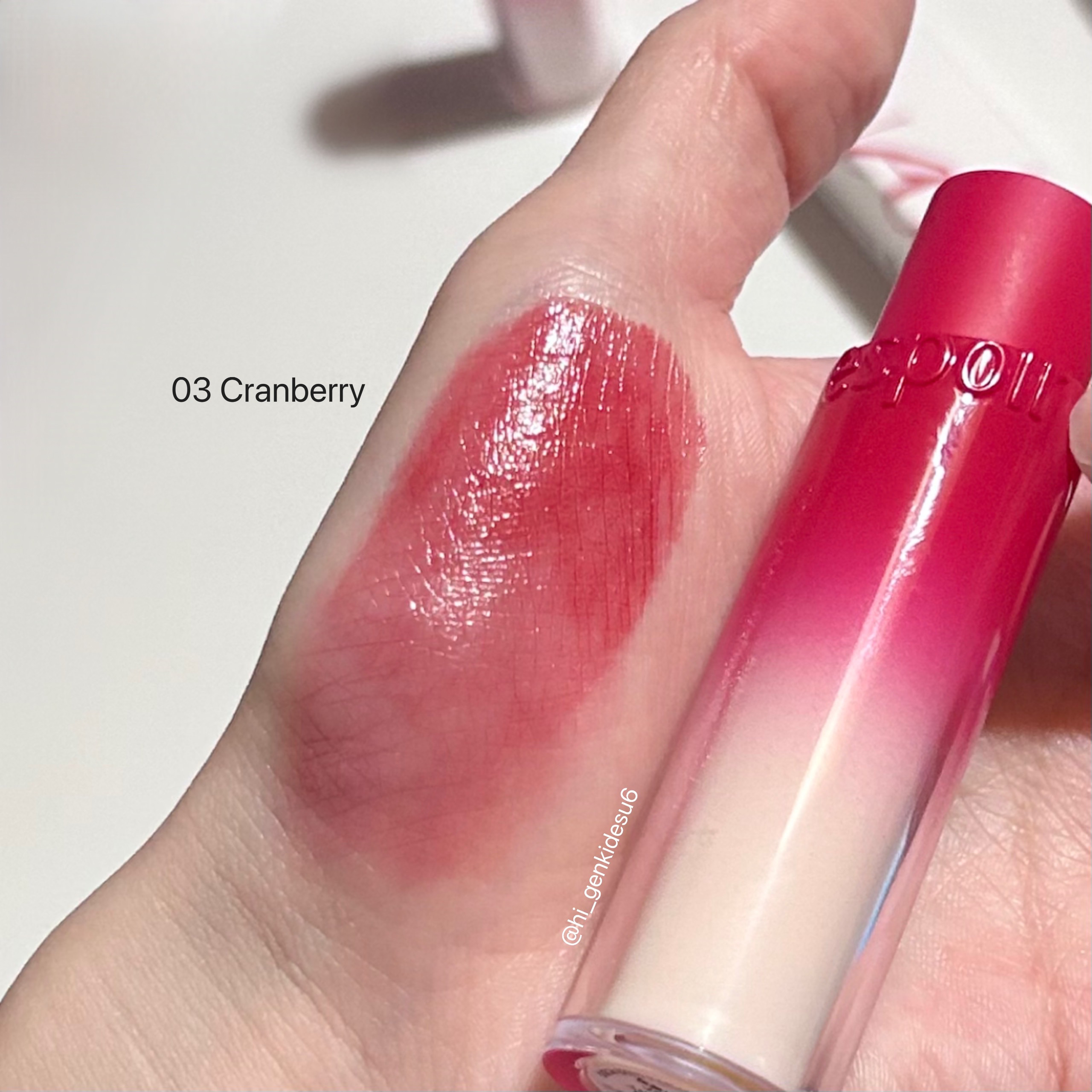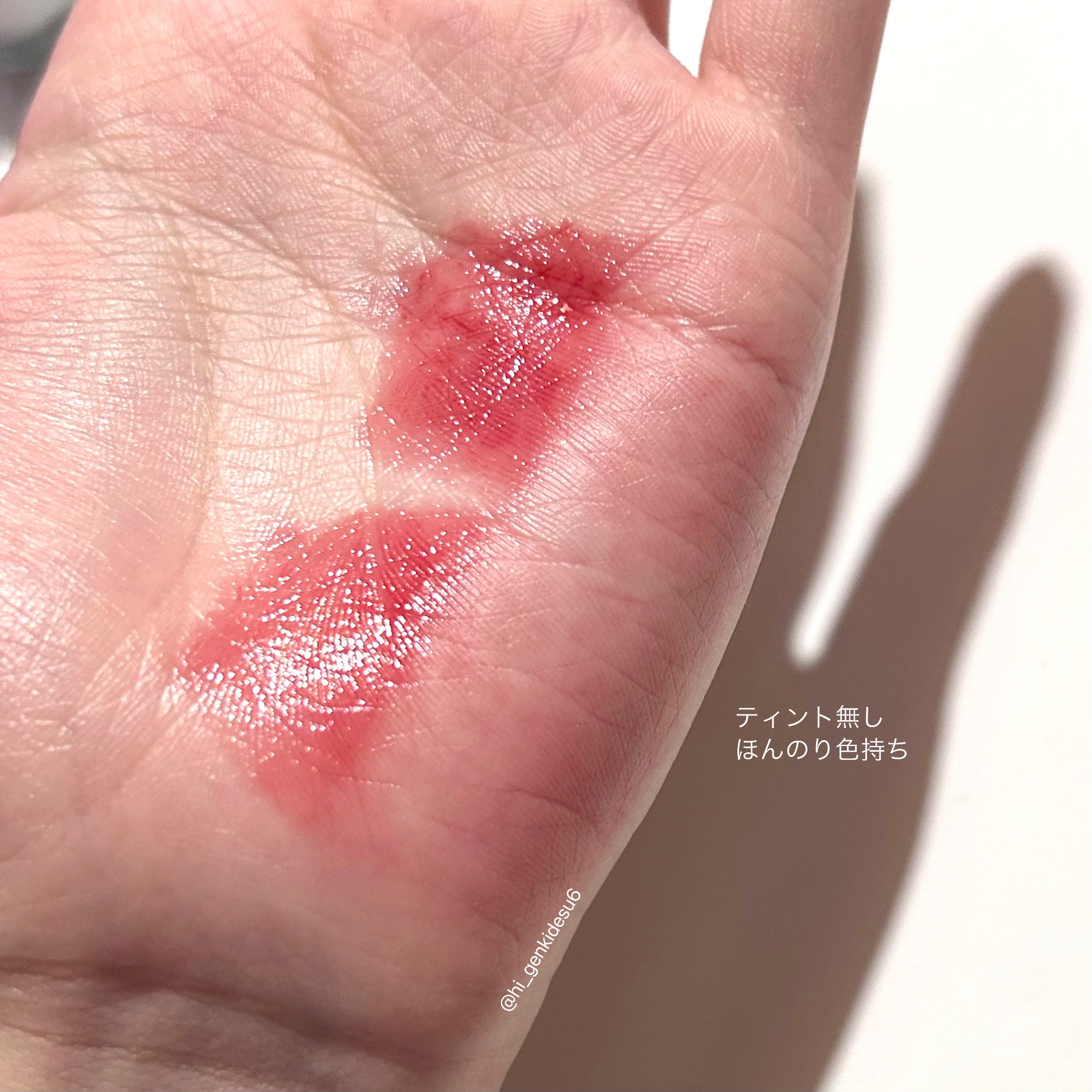 ツヤは砂糖を煮つめたシロップみたいな甘〜い光沢感!! 密着力が高いので唇を「んまっ」と擦り合わせてもリップが動きにくい。 このティントはツヤも綺麗ですしカラバリも豊富で、沢山持っているリップの中でも一軍です👍🏻