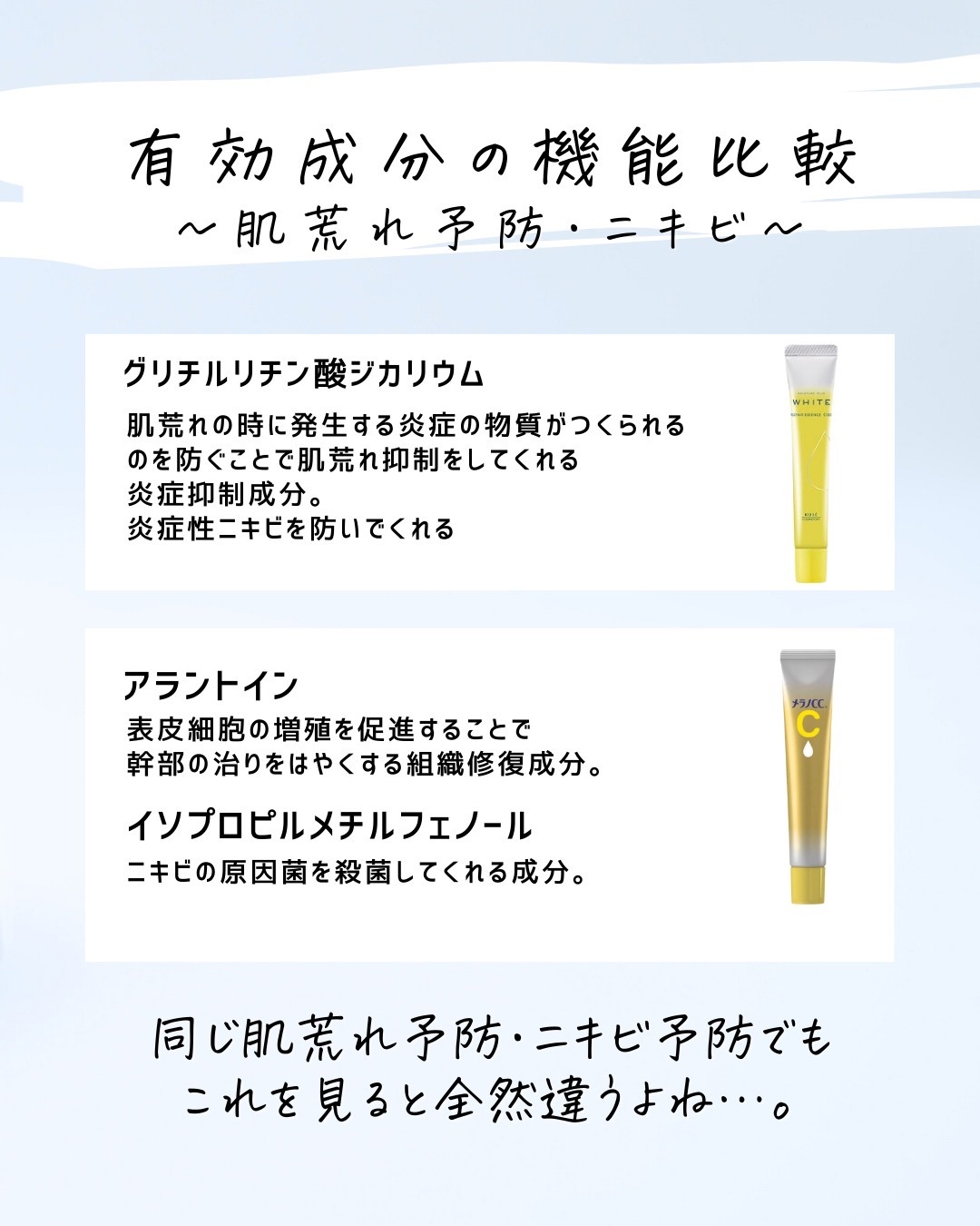 モイスチュアマイルドはビタミンC誘導体はもちろん抗炎症成分のグリチルリチン酸ジカリウムやメラニン生成を防いでくれるトラネキサム酸が配合されています! モイスチュアマイルドにはメラノCCにはないトラネキサム酸が入っているのが強い!ニキビ跡のうるおいケアとしてヒアルロン酸やコラーゲンなども含まれているので乾燥が気になる方はこちらがおすすめです 特にモイスチュアマイルドは6つのフリー処方を謳っていてやさしい使い心地が売りのようなので敏感肌の方には特にこちらをおすすめしたいです!