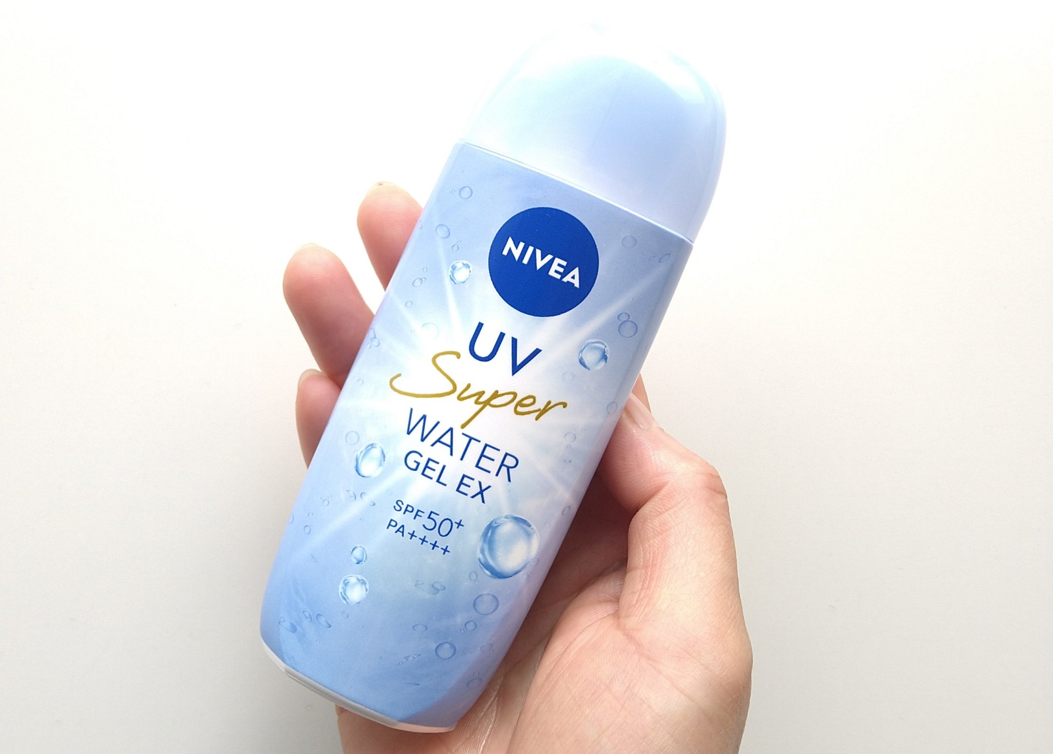 ニベアUVウォータージェルEX¥985☑︎SPF50+、PA++++☑︎みずみずしい☑︎ジェルだからよくなじむ!☑︎せっけんで落とせる☑︎スーパーウォータープルーフ☑︎モロモロしない◻︎優しいほのかなフローラルアロマの香り、ちょーっと気になる...