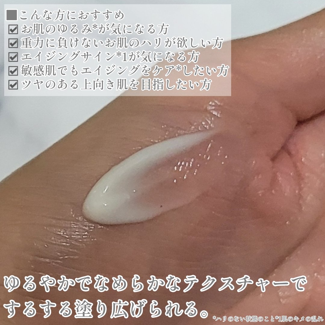 緩んだお肌にハリを与える、キー成分「Bペプチド-X50※1」が高濃度で配合されています。 なんと、基材となるベースには水ではなく、「コメ発酵液※2」を使っているのです。なんという贅沢! このベースだけでも十分に効果がありそうなのに、ハリ肌に仕上げるためにいろいろな成分を入れていただいていて、なんと頼もしい。 いつでも新鮮に開封することができる、レフィルと容器がセパレートしているタイプです。 テクスチャーは、なんとももったりとしたクリームが出てきて、リッチな使い心地です。 使い心地なめらかで保湿力も高くて、心地よく使用させていただいております♡