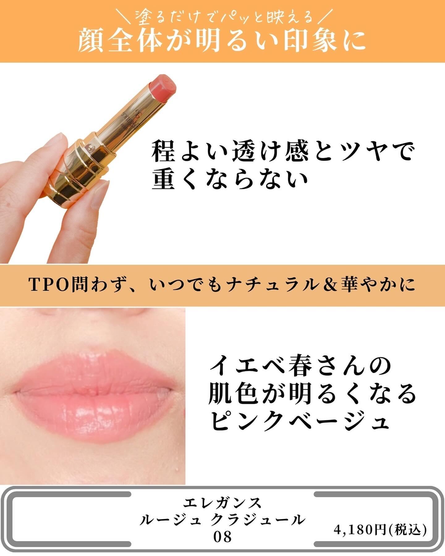 | 口紅・リップスティックランキング第154位 | なめらかな塗り心地でむっちりとした 艶のある仕上がり。つけた瞬間肌がパッと明るく見えて感激した❣️ | 詳細を見る | |