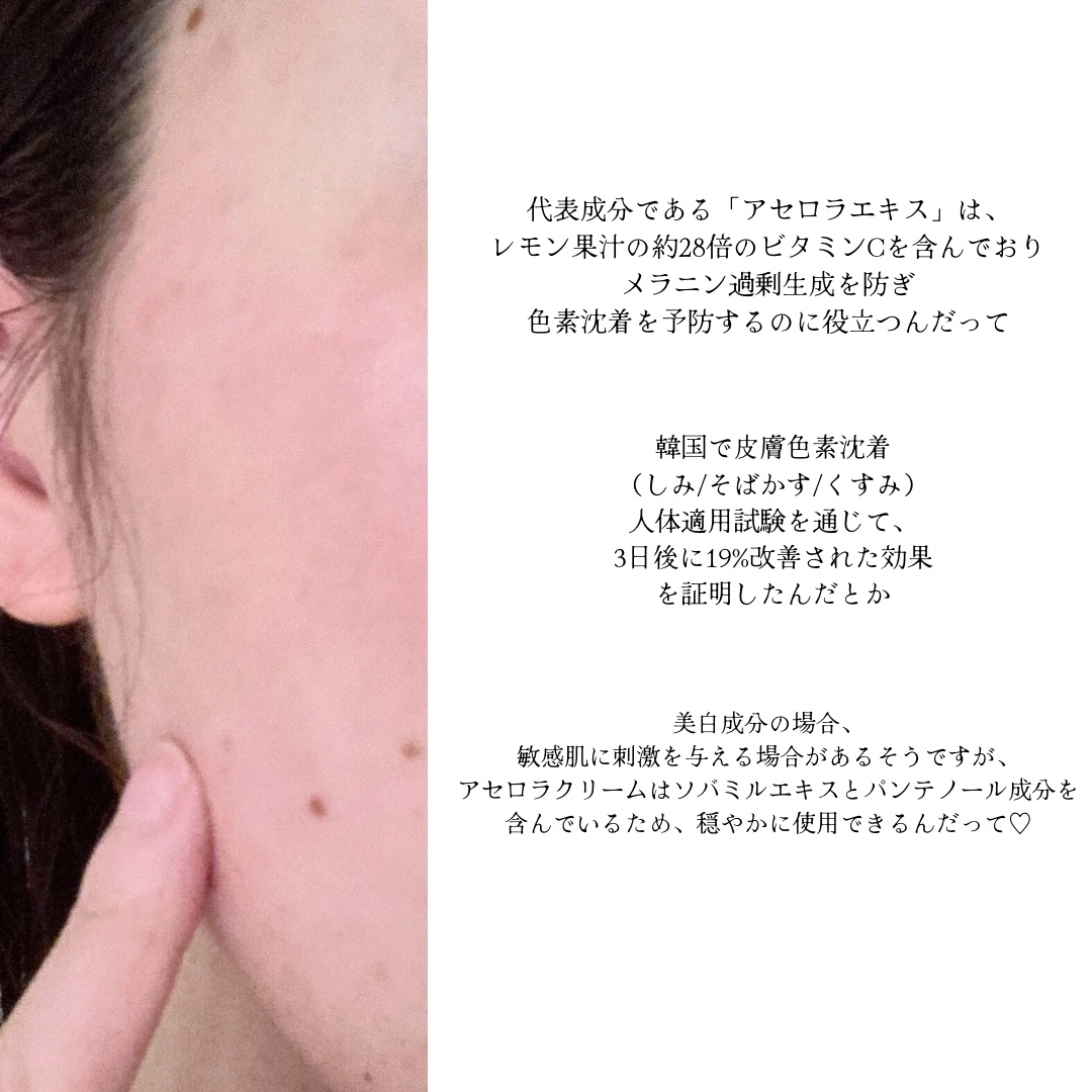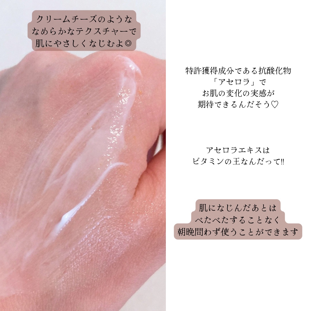 - 長い研究の末に作られたくすみ*1ケアクリームで、独自整肌成分「アセロラ」抽出物を配合。 肌を整えるパンテノール*2、ドクダミエキス*2を含有しており、気になる部分を集中ケア。肌に潤いをあたえて、くすみ*1をケアし、肌荒れを防いで透明感のある肌に導きます。肌低刺激テスト*3臨床試験を完了済み。 敏感な肌にも使え、低刺激な使い心地のクリームで、デイリーケア製品として使用可能。 *1乾燥による *2保湿成分 *3すべての方に皮膚刺激が発生しないということではありません