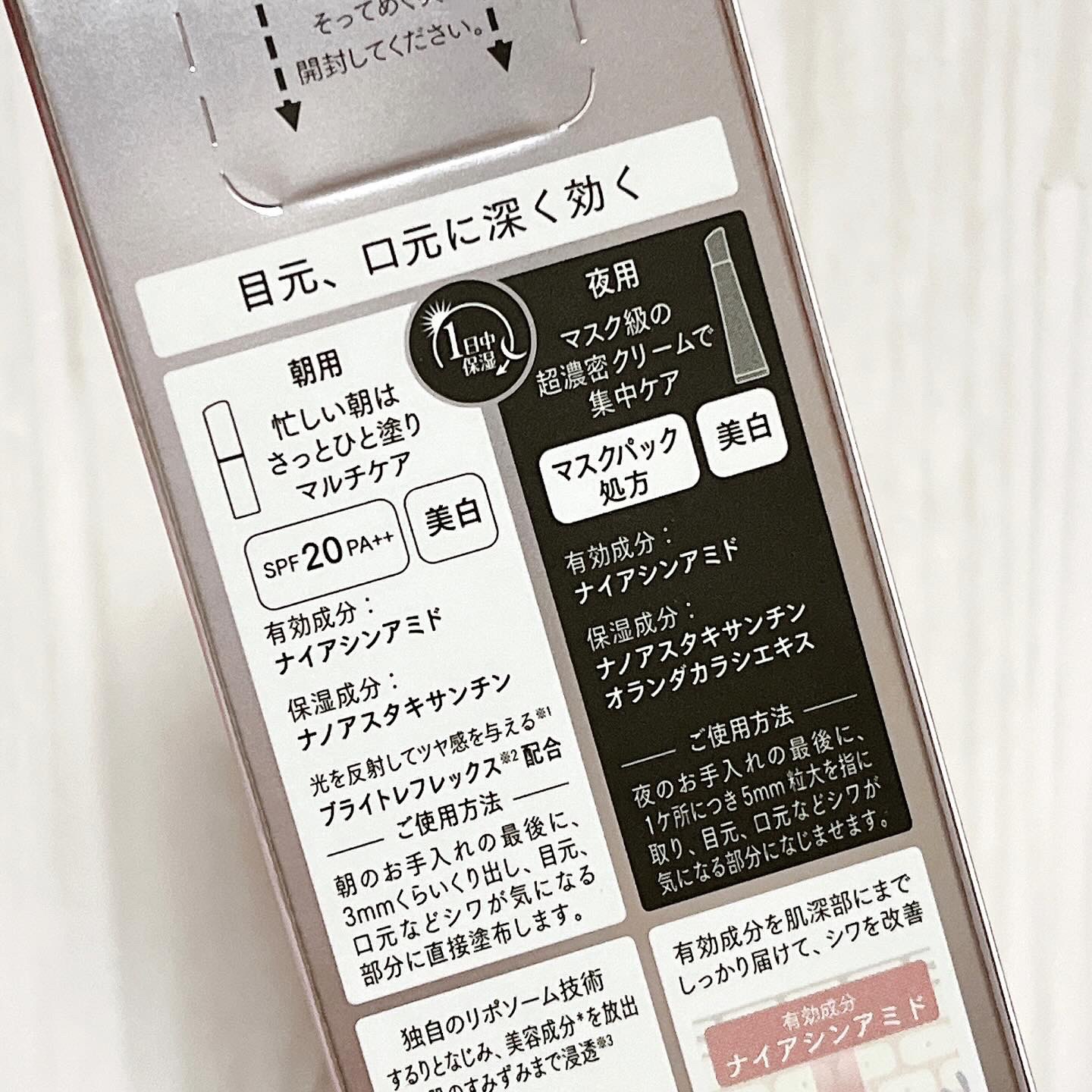 超濃密パッククリームの夜用シワ改善クリーム 寝ているときに枕に触れることで生じるダメージに着目 とろけるスティックタイプの朝用シワ改善美容液 日中笑ったり話したりすることによって生じるダメージに着目 どちらもとてもしっとりするので、目元の乾燥小皺は使い始めてすぐ気にならなくなりました🎶