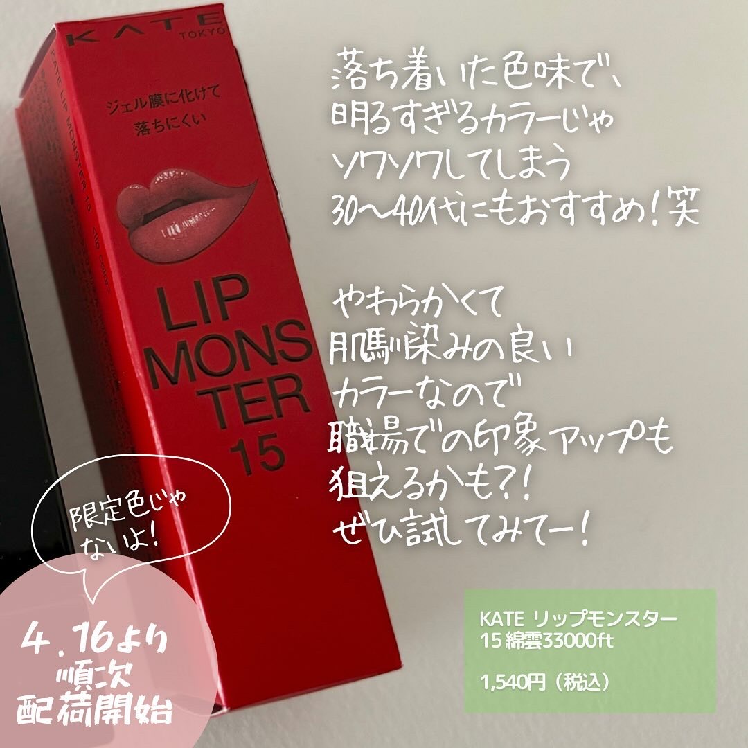 万能に何でも合っちゃう🩷KATEリップモンスター15綿雲33000ft1,540円(税込)最近リプモン色々種類出てるけど、やっぱりスティックのリップタイプのノーマルのやつが一番手軽に使える気がするなぁ🥹ついつい手が伸びる🖐🏻💕発売からは月日が...