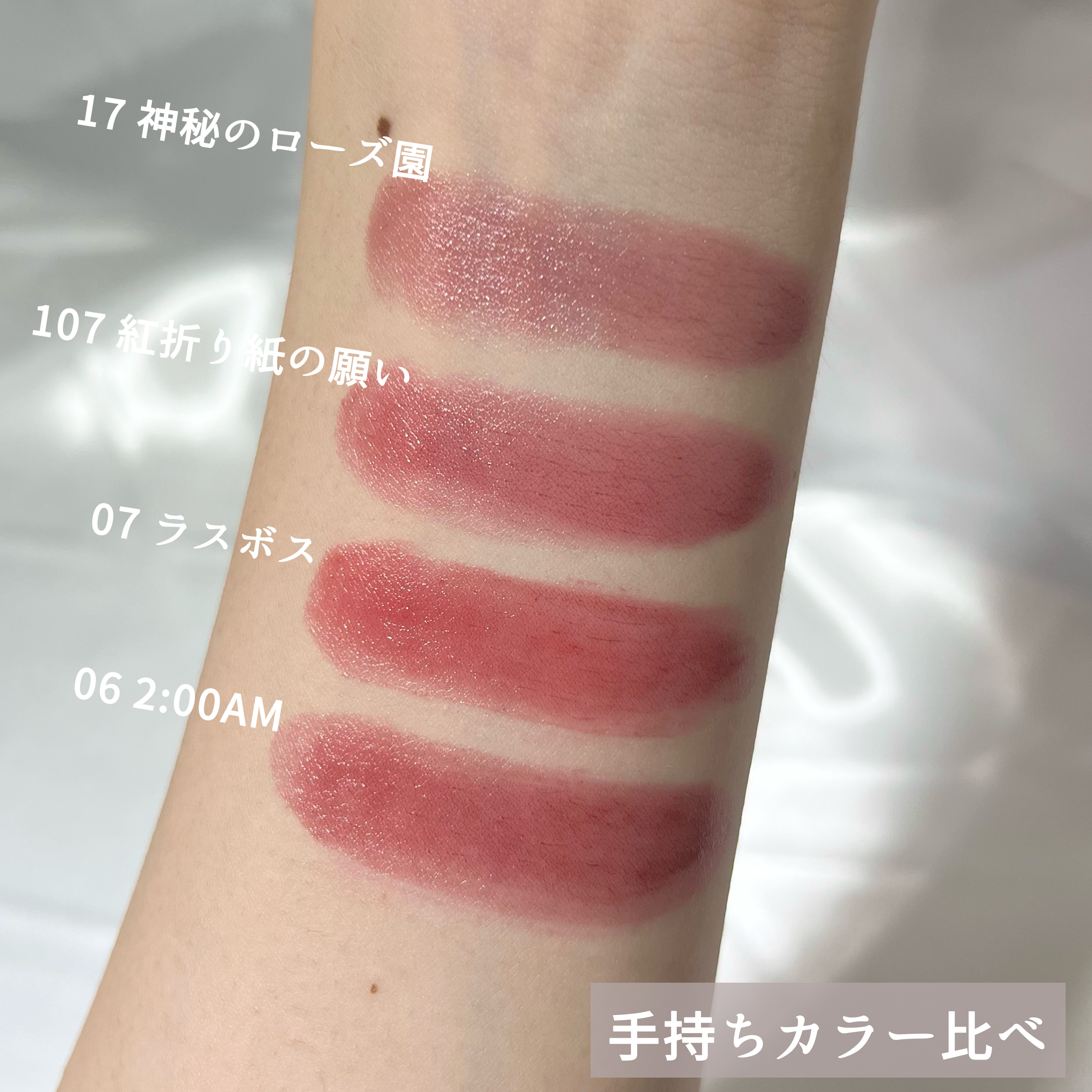 - <01 欲望の塊> テトライソステアリン酸ジペンタエリスリチル、トリ(カプリル酸/カプリン酸)グリセリル、オクチルドデカノール、ラウロイルグルタミン酸ジ(フィトステリル/オクチルドデシル)、ビスアルキル(C16-18)グリセリルウンデシルジメチコン、イソノナン酸イソトリデシル、水添ポリイソブテン、ラウロイルグルタミン酸ジ(オクチルドデシル/フィトステリル/ベヘニル)、パラフィン、合成ワックス、ダイマージリノール酸(フィトステリル/イソステアリル/セチル/ステアリル/ベヘニル)、マイクロクリスタリンワックス、水添マイクロクリスタリンワックス、ヒドロキシステアリン酸エチルヘキシル、トコフェロール、ホホバ種子油、オリーブ果実油、アーモンド油、(エチレン/プロピレン)コポリマー、ポリエチレン、ジメチコン、(+/-)(チタン/酸化チタン)焼結物、マイカ、ラウロイルアスパラギン酸Na、ラウロイルリシン、塩化亜鉛、酸化チタン、酸化鉄、水酸化Al、硫酸Ba、トリイソステアリン酸イソプロピルチタン、酸化スズ、ホウケイ酸(Ca/Al)、合成フルオロフロゴパイト、黄4、黄5、赤104(1)、赤201、赤202 <02 ピンクバナナ> テトライソステアリン酸ジペンタエリスリチル、トリ(カプリル酸/カプリン酸)グリセリル、オクチルドデカノール、ラウロイルグルタミン酸ジ(フィトステリル/オクチルドデシル)、ビスアルキル(C16-18)グリセリルウンデシルジメチコン、イソノナン酸イソトリデシル、水添ポリイソブテン、ラウロイルグルタミン酸ジ(オクチルドデシル/フィトステリル/ベヘニル)、パラフィン、合成ワックス、ダイマージリノール酸(フィトステリル/イソステアリル/セチル/ステアリル/ベヘニル)、マイクロクリスタリンワックス、水添マイクロクリスタリンワックス、ヒドロキシステアリン酸エチルヘキシル、トコフェロール、ホホバ種子油、オリーブ果実油、アーモンド油、(エチレン/プロピレン)コポリマー、ポリエチレン、ジメチコン、(+/-)(チタン/酸化チタン)焼結物、マイカ、ラウロイルアスパラギン酸Na、ラウロイルリシン、塩化亜鉛、酸化チタン、酸化鉄、水酸化Al、硫酸Ba、トリイソステアリン酸イソプロピルチタン、酸化スズ、ホウケイ酸(Ca/Al)、合成フルオロフロゴパイト、黄4、黄5、赤104(1)、赤201、赤202 <03 陽炎> テトライソステアリン酸ジペンタエリスリチル、トリ(カプリル酸/カプリン酸)グリセリル、オクチルドデカノール、ラウロイルグルタミン酸ジ(フィトステリル/オクチルドデシル)、ビスアルキル(C16-18)グリセリルウンデシルジメチコン、イソノナン酸イソトリデシル、水添ポリイソブテン、ラウロイルグルタミン酸ジ(オクチルドデシル/フィトステリル/ベヘニル)、パラフィン、合成ワックス、ダイマージリノール酸(フィトステリル/イソステアリル/セチル/ステアリル/ベヘニル)、マイクロクリスタリンワックス、水添マイクロクリスタリンワックス、ヒドロキシステアリン酸エチルヘキシル、トコフェロール、ホホバ種子油、オリーブ果実油、アーモンド油、(エチレン/プロピレン)コポリマー、ポリエチレン、ジメチコン、(+/-)(チタン/酸化チタン)焼結物、マイカ、ラウロイルアスパラギン酸Na、ラウロイルリシン、塩化亜鉛、酸化チタン、酸化鉄、水酸化Al、硫酸Ba、トリイソステアリン酸イソプロピルチタン、酸化スズ、ホウケイ酸(Ca/Al)、合成フルオロフロゴパイト、黄4、黄5、赤104(1)、赤201、赤202 <04 パンプキンワイン> テトライソステアリン酸ジペンタエリスリチル、トリ(カプリル酸/カプリン酸)グリセリル、オクチルドデカノール、ラウロイルグルタミン酸ジ(フィトステリル/オクチルドデシル)、ビスアルキル(C16-18)グリセリルウンデシルジメチコン、イソノナン酸イソトリデシル、水添ポリイソブテン、ラウロイルグルタミン酸ジ(オクチルドデシル/フィトステリル/ベヘニル)、パラフィン、合成ワックス、ダイマージリノール酸(フィトステリル/イソステアリル/セチル/ステアリル/ベヘニル)、マイクロクリスタリンワックス、水添マイクロクリスタリンワックス、ヒドロキシステアリン酸エチルヘキシル、トコフェロール、ホホバ種子油、オリーブ果実油、アーモンド油、(エチレン/プロピレン)コポリマー、ポリエチレン、ジメチコン、(+/-)(チタン/酸化チタン)焼結物、マイカ、ラウロイルアスパラギン酸Na、ラウロイルリシン、塩化亜鉛、酸化チタン、酸化鉄、水酸化Al、硫酸Ba、トリイソステアリン酸イソプロピルチタン、酸化スズ、ホウケイ酸(Ca/Al)、合成フルオロフロゴパイト、黄4、黄5、赤104(1)、赤201、赤202 <05 ダークフィグ> テトライソステアリン酸ジペンタエリスリチル、トリ(カプリル酸/カプリン酸)グリセリル、オクチルドデカノール、ラウロイルグルタミン酸ジ(フィトステリル/オクチルドデシル)、ビスアルキル(C16-18)グリセリルウンデシルジメチコン、イソノナン酸イソトリデシル、水添ポリイソブテン、ラウロイルグルタミン酸ジ(オクチルドデシル/フィトステリル/ベヘニル)、