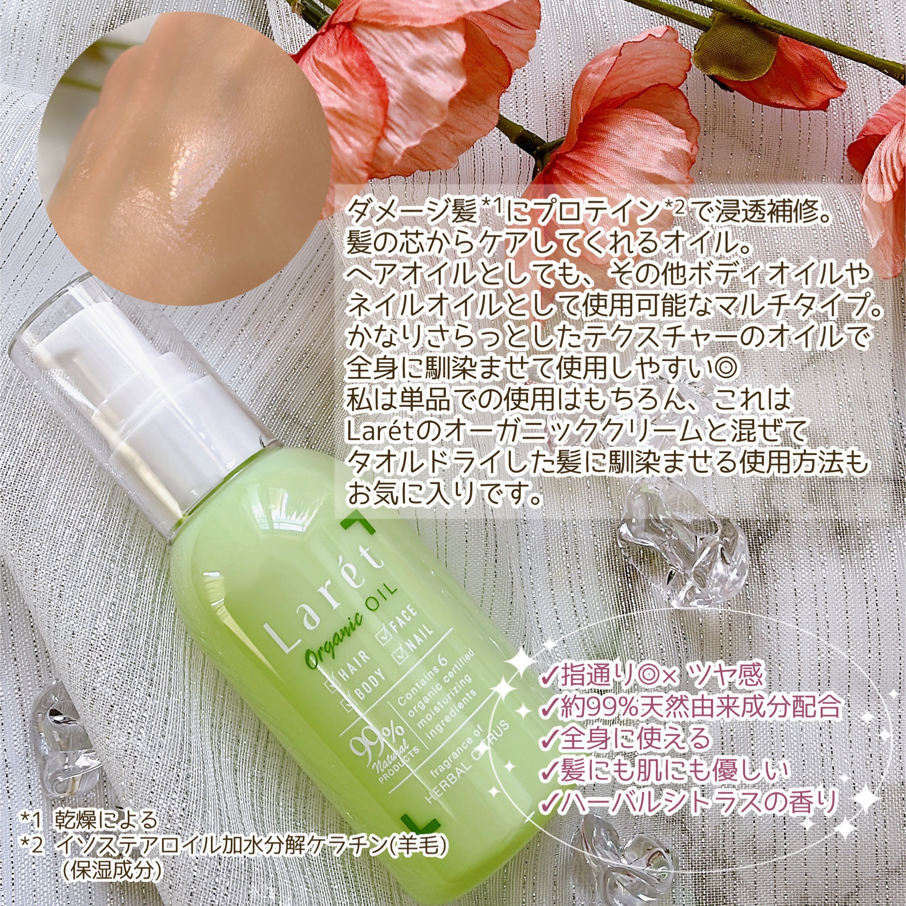 ダメージを補修して、髪のまとまりや潤い感をアップしてくれる。オイルですが、サラッとしたテクスチャーです。 ハーバルシトラスの香りがふわっと広がって、凄く良い香り🤗キューティクルを整えることで指通りの良いサラサラヘアにしてくれます。 重くないのでオイル苦手な方でも使いやすいと思います💕