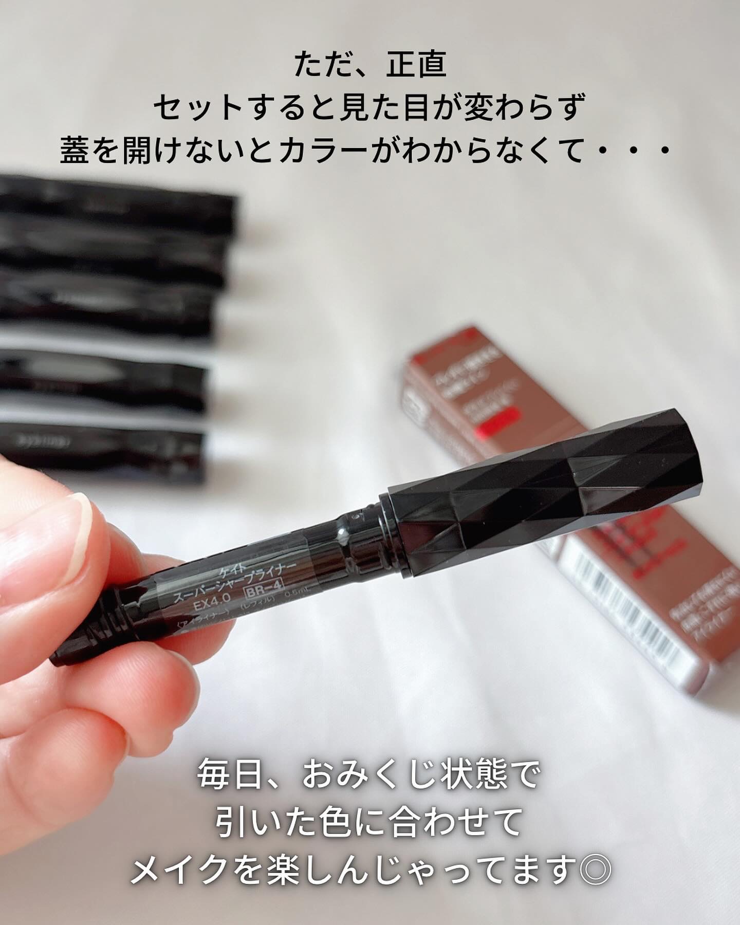 - 強い筆圧でも、どこを持っても極細ラインがブレずに描け、色が長時間持続するリキッドライナー。 ●極細ラインを安定して描けるケイト独自開発筆。 ●どこを持っても指先がフィットするダイヤモンドカット形状の容器。 ●汗・水に強く、号泣しても落ちにくいウォータープルーフタイプ。 ●皮脂・こすれに強い、スマッジプルーフタイプ。 ●ケイト スーパーシャープライナーEX4.0(レフィル)をセット可能です。 ●改良ポイント 極細ラインが安定して描き続けられる独自開発の筆 落ちにくさアップ 付け替えできる新容器「リ・ウェアボトル」 専用レフィルを付け替えて何度も繰り返し使える! 好きな色を組み合わせられるWエンド使用も! ※ケイト スーパーシャープライナーEX3.0と比較して <ショート筆 レフィル> 超極細ラインがちょこちょこ描けて失敗しにくい 毛先が短いショート筆タイプのリキッドライナーレフィル。号泣しても落ちにくく、皮脂・こすれに強い。 ●お湯オフタイプ ●一日中色持続 ●ケイト スーパーシャープライナーEX4.0のホルダー本体部、またはスーパーシャープライナー用ホルダーにセットして使う付け替えタイプです。筆先ごと付け替えられます。 ●全5色 BK-1(漆黒ブラック) BR-1(自然なブラウン) BR-2(ビターブラウン) BR-6(ダークブラウン) GY-1(ダークグレージュ)
