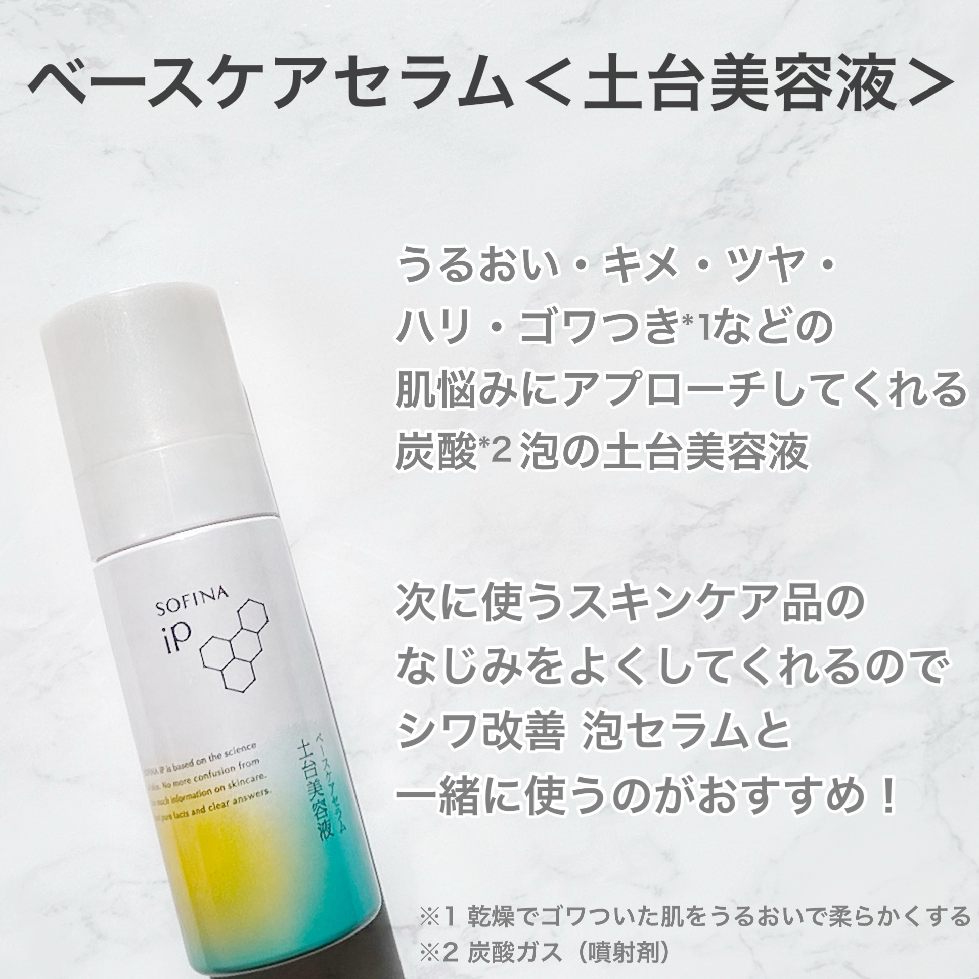 - 【医薬部外品】 おでこ・目元・口元など、顔に多数存在する面のシワに着目。 毛穴より小さい100%*1炭酸*2泡 × 有効成分 ナイアシンアミド 新世代*3のシワ改善マイクロバブル美容液、誕生。 見た目印象を左右するキメジワなど、顔の面に複数存在するシワにもアプローチ 毛穴より小さいマイクロバブルがすみずみまで肌に密着し首より上、まとめてシワ改善する、濃密泡仕立ての美容液 うるおってハリツヤ印象へ フレッシュハーバルエナジーの香り *1 炭酸ガス(噴射剤) *2 100%炭酸ガスの噴射剤が作りだす泡の美容液 *3 ソフィーナ iPにおいて