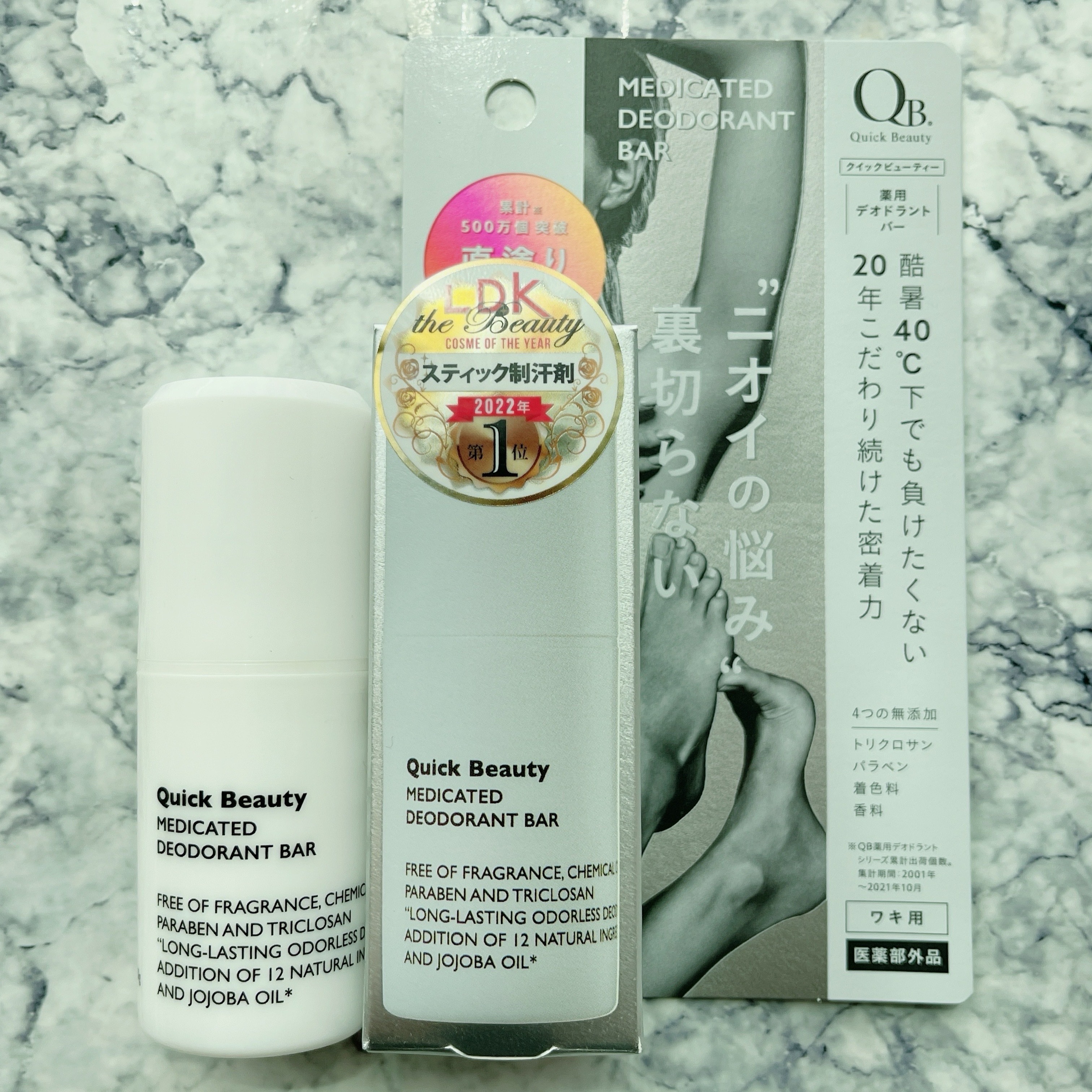クイックビューティーQB薬用デオドラントバー40C。LIPS購入品。酷暑40度でも負けたくない制汗剤。着色料や香料は入っていません。密着力はありますね。サラサラな処方です。持ち歩きがしやすい大きさなので塗り直しもラクラクです。汗の匂いは抑えら...