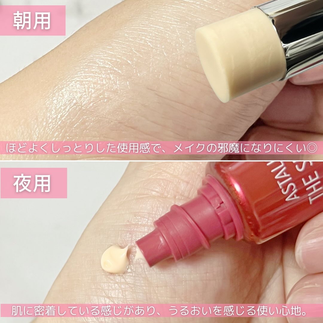 富士フイルムが開発した薬用シワ改善美容液!朝用と夜用の2種類があり、それぞれ異なるアプローチでシワを改善します。 朝用はスティックタイプでメイクの上からも使える手軽さが魅力♪紫外線や乾燥から肌を守り、日中の表情ジワを予防します。 夜用はコクのあるクリームが睡眠中の肌をしっかり保湿。寝ている間にシワを改善し、ハリと弾力のある肌へ導きます。