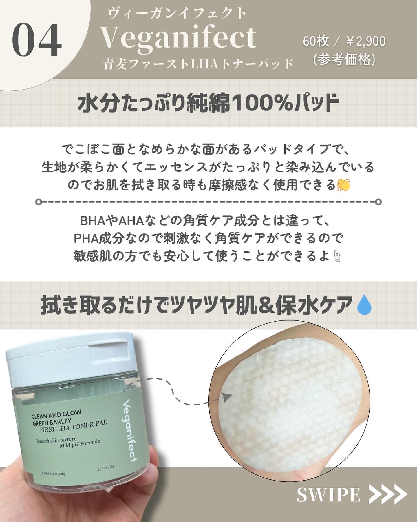 使い切りレビューVeganifect青麦ファーストLHAトナーパッド60枚パッドを肌にのせた瞬間ひんやりクーリングトナーパッド✔︎エンボス面で角質・皮脂・汚れをすばやく拭き取り✔︎なめらか面でパック▽実際に使ってみたよ▽薄過ぎず厚すぎない程よ...