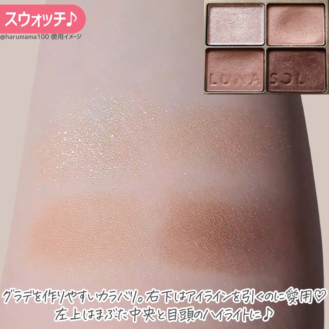 - ベージュを基調としながらも、発色、光感、透明度を計算した組み合わせをセットした4色アイシャドウ。光によって発色するルーセントカラーピグメントが、肌を美しく見せます。陰影を際立たせ、立体感ある印象的な目元を演出します。