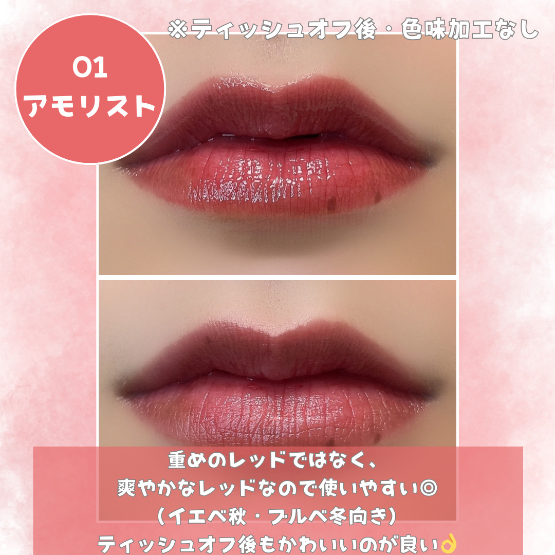 | 乾燥しにくく、艶感をキープしてくれて、ティント特有の色持ちも良く、ぷるっとしたジューシーな唇に仕上がります | 詳細を見る | |
