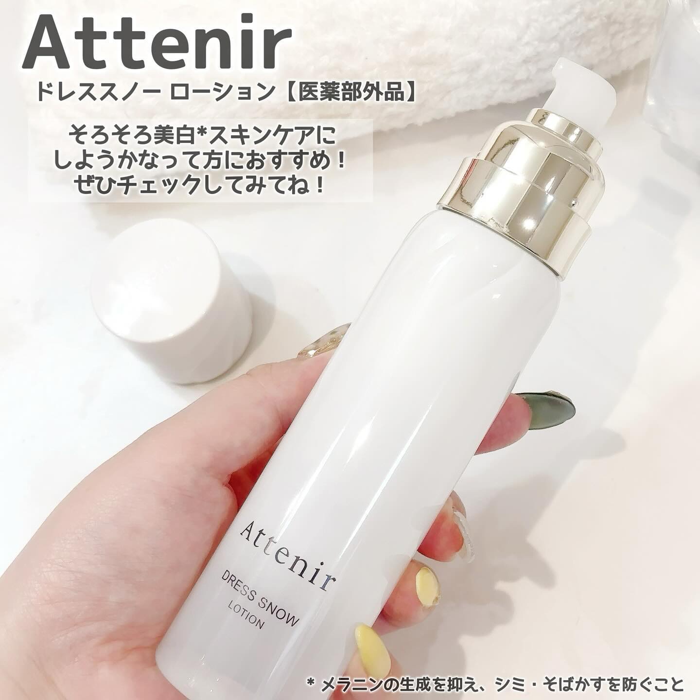 #PR#アテニア@attenir_official🌟アテニア商品名:アテニア ドレススノーローション【医薬部外品】販売名:アテニアローションDSn洗顔後、2~3プッシュ分を肌になじませて使用します。美白※1もエイジングケア※2も気になる方にお...