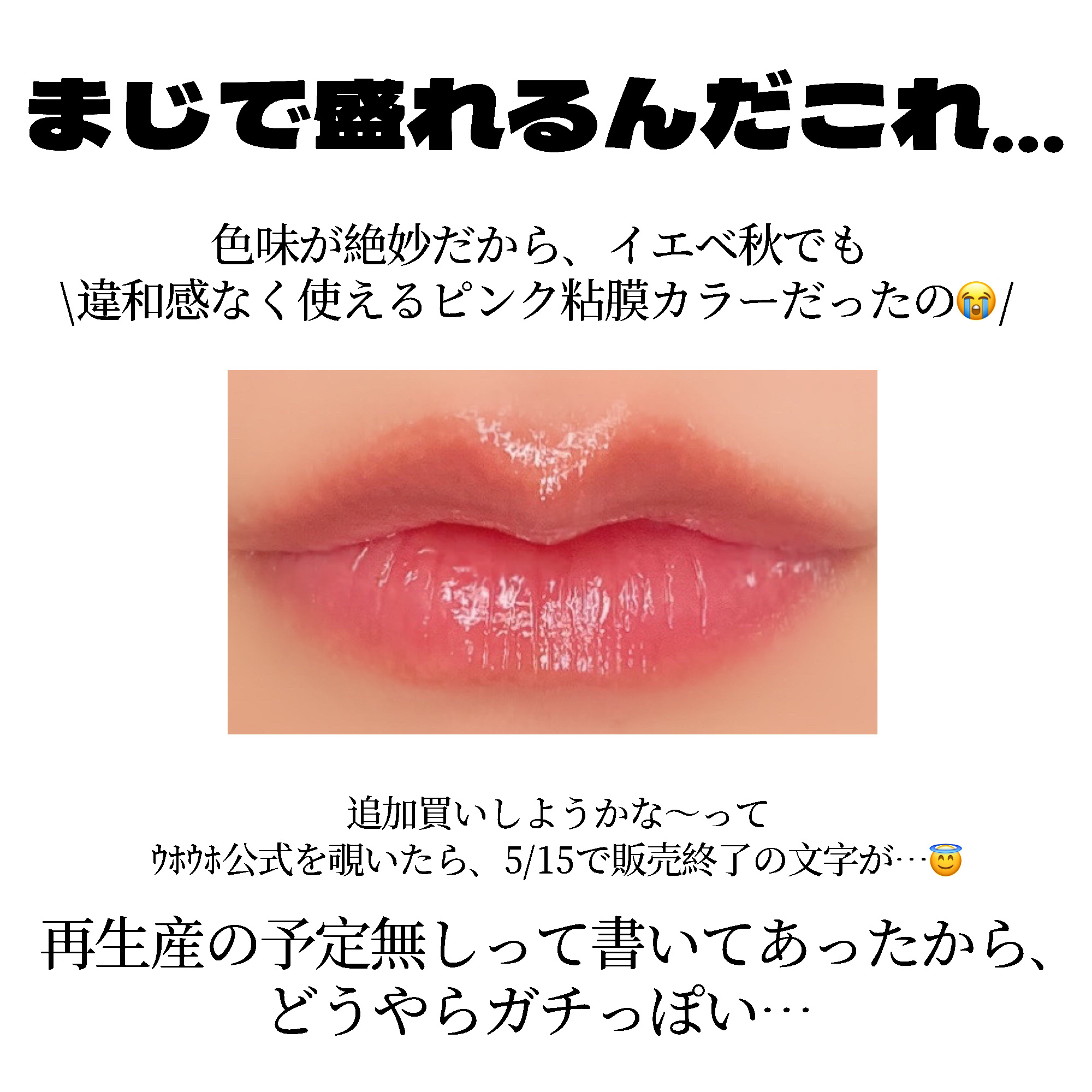 日本限定も発売💡メガ割で1,056円で買えるよ🐰💖!! 新作が出るたびに話題になるグロス🤭💖 私もちょっと前のメガ割で購入✨ 塗った瞬間より、数秒待った方がうるみと艶が増して可愛い🍓🍒