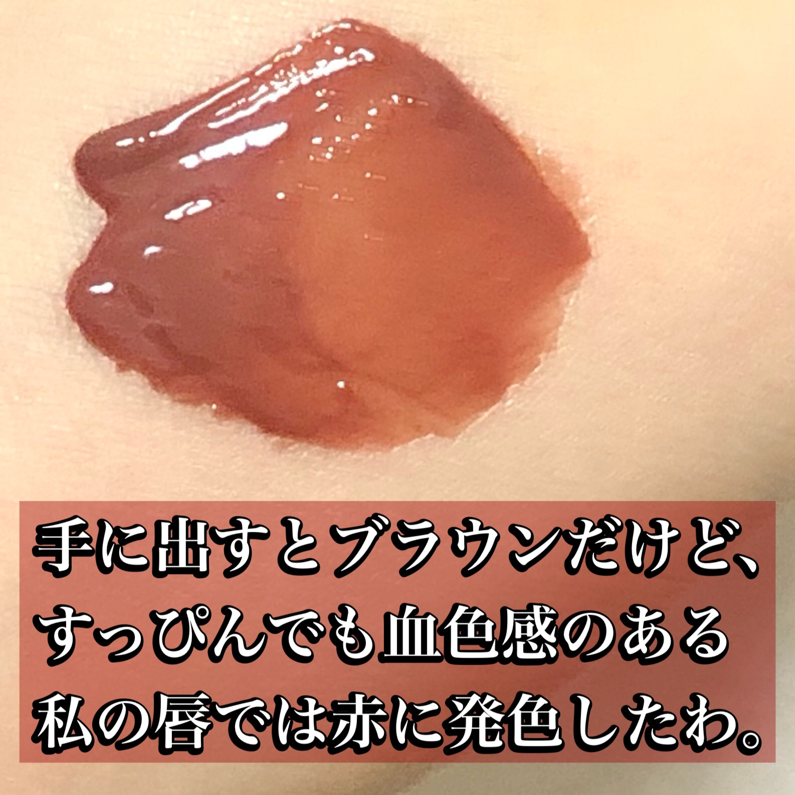 公式では「赤みを効かせたレディッシュブラウン」と説明されていて、まさにその通り過ぎる色味。 一度塗りだと色付きリップくらいのシアーな発色なんだけど、重ね塗りするほどに良い女感が増し増しに… 保湿力は十分にあって、乾燥は全く感じないけど、色持ちは良くない(食事をすれば落ちてしまうレベル)なので、そこはご承知おきを。
