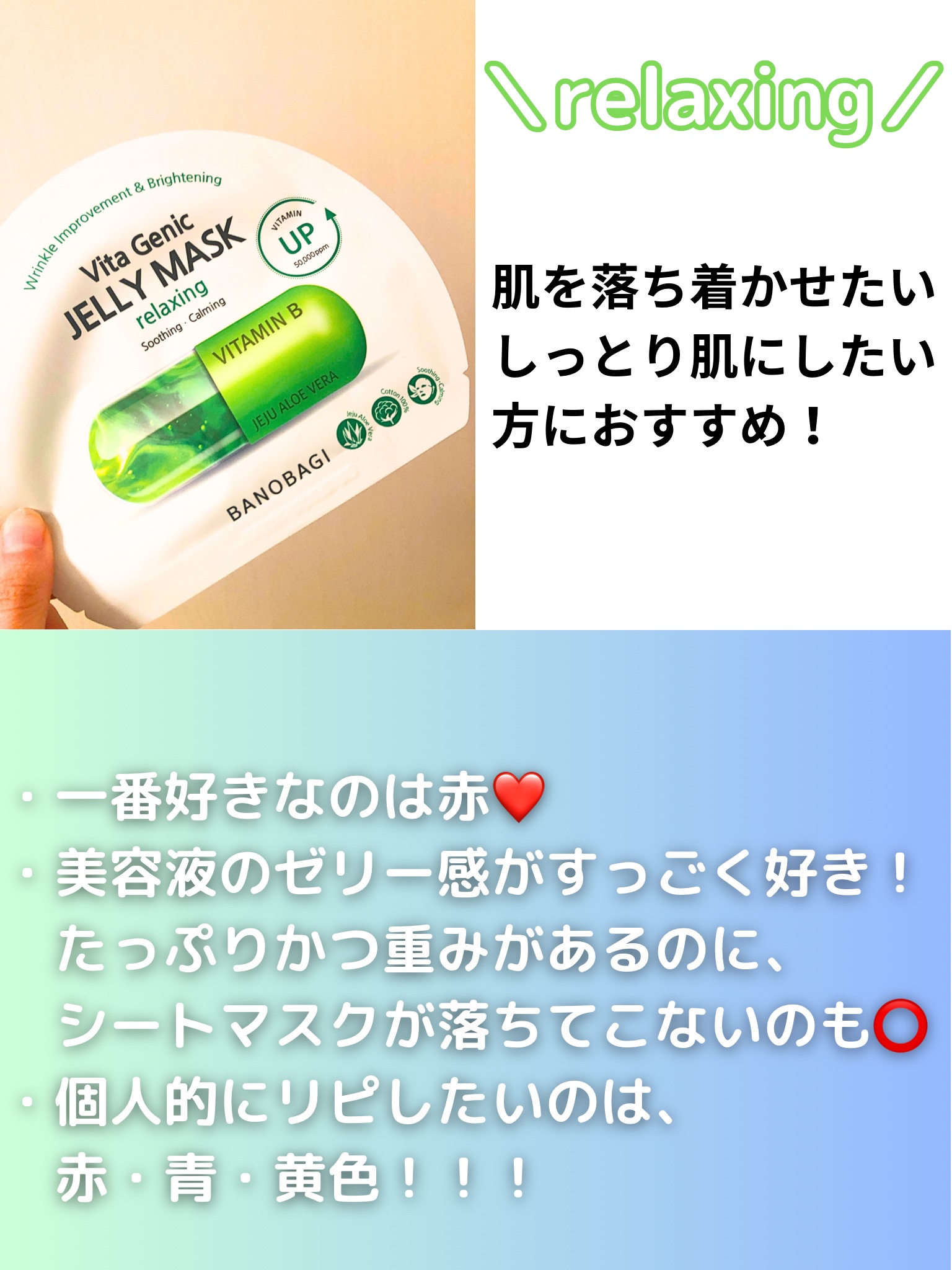 ・・・BANOBAGIビタジェニックゼリーマスク💛ホワイトニング💚シカBANOBAGI様からいただきました♪ゼリーのようなプルプルなエッセンスがたっぷりと入っていました✨ちょうどいい暑さのシートで肌にピッタリと密着してくれます◎どちらもエッセ...