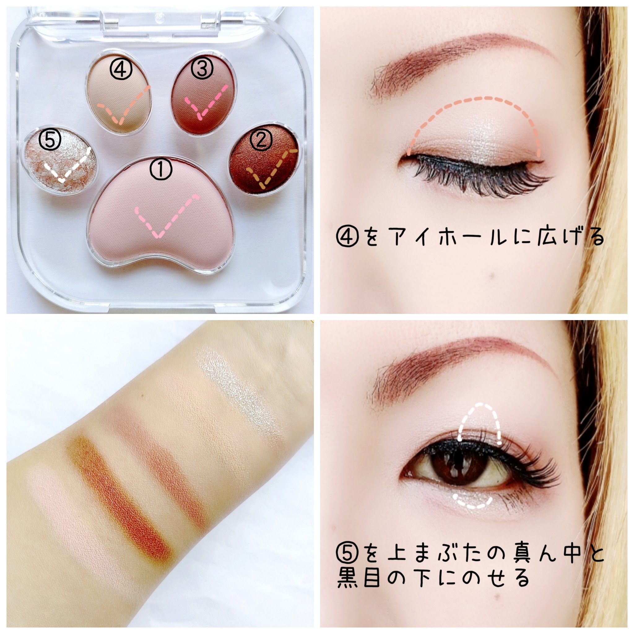 ベースカラー、締め色、ラメがそろったかわいい5色パレット💕 見た目の可愛さだけじゃなくて機能性も◎❣️ 発色が想像以上に良くて見たままのカラーでメイクできるのが楽しい♥️ 気まぐれ猫ちゃんのような女の子におすすめ🐱ฅ