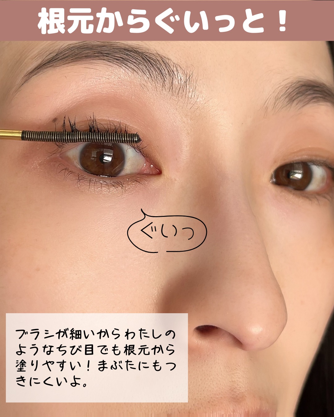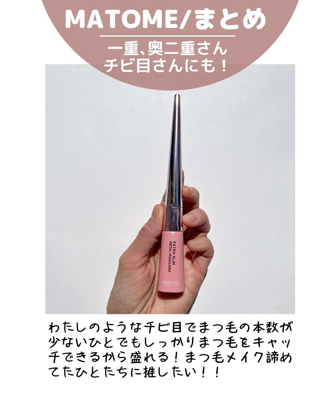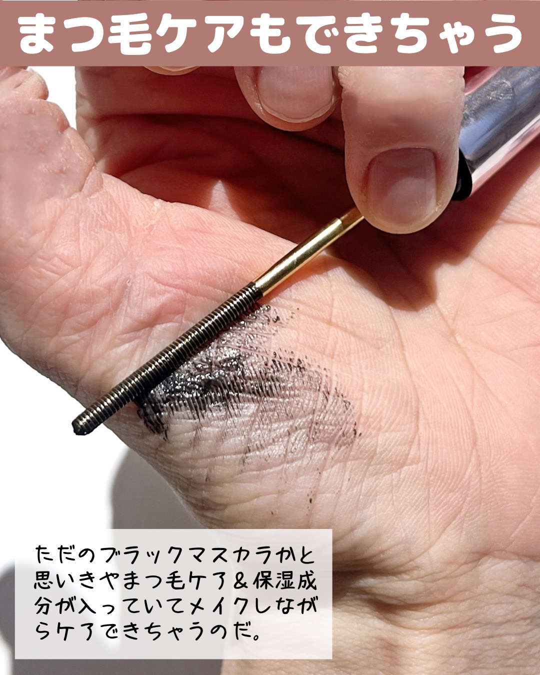 2.5mmのスリムメタルブラシでダマにならず短いまつ毛まで塗布できる ダマにならずきれいにセパレートして、目頭などの短いまつ毛も塗りやすく、長いまつ毛を演出してくれるから目元に存在感が出ると思う 動画は二度塗りしてますが、あまりダマにならずセパレートされてるのではないかと思います
