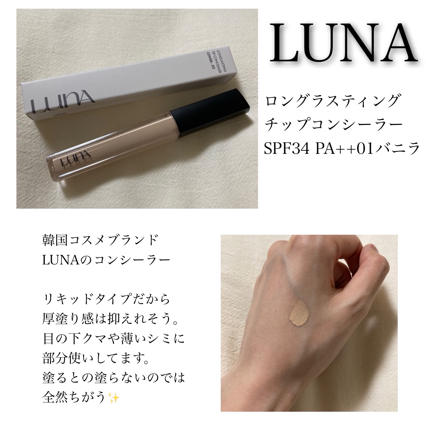 LUNAロングラスティングチップコンシーラー02ベージュSPF34PA++わたしの濃いシミにはあまり隠せなかった😅...