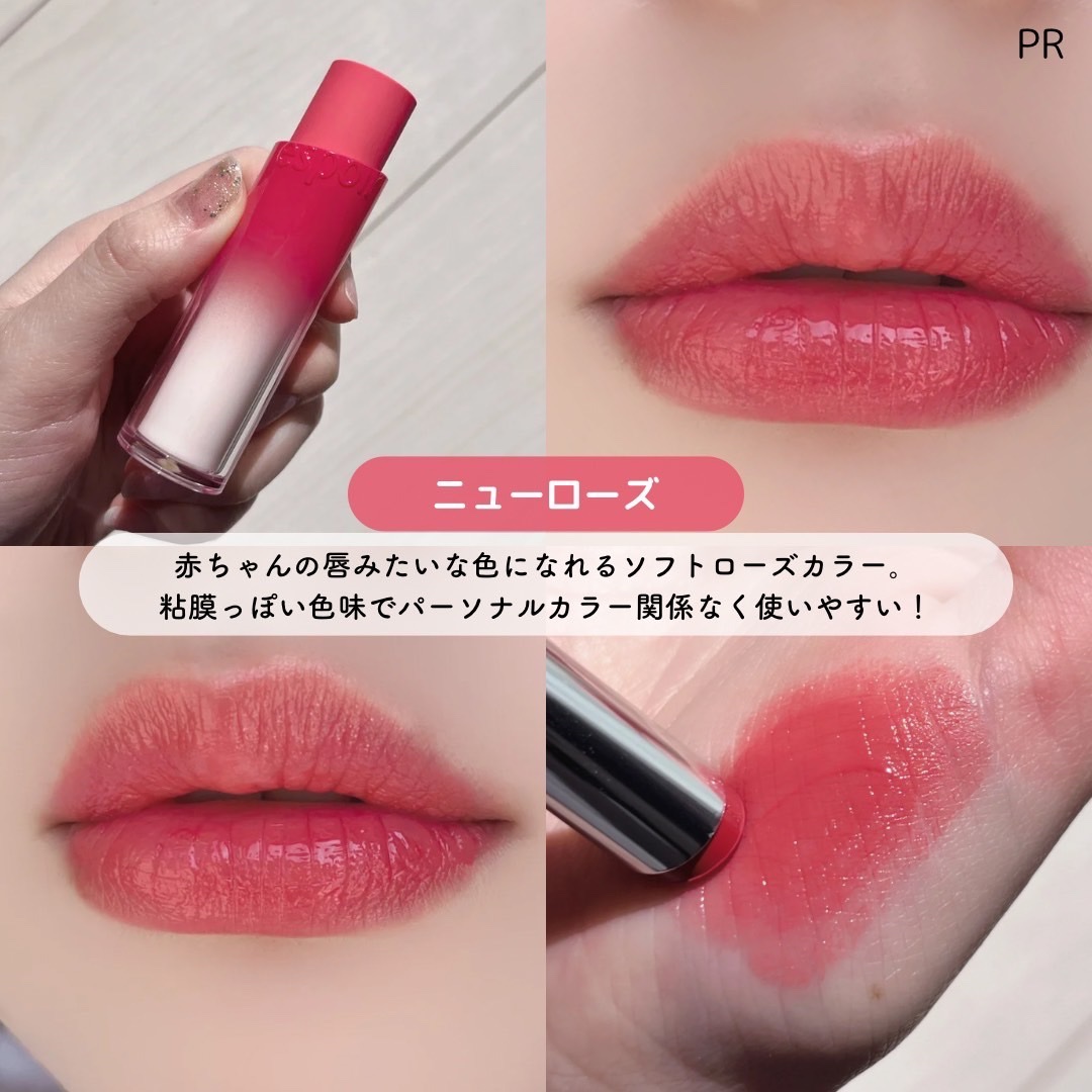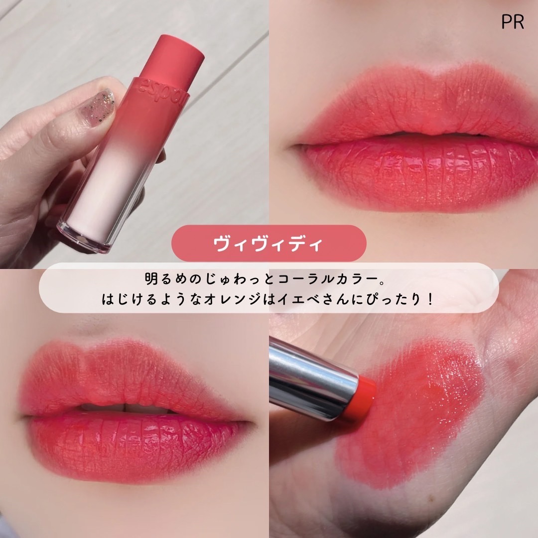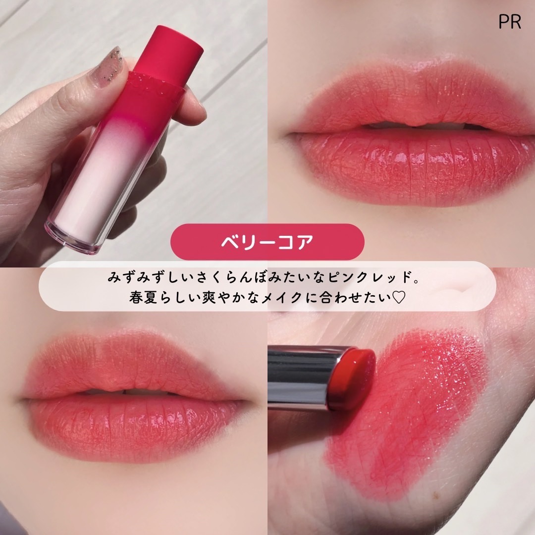 - <01 ヴィヴィディ(Vividy)【EC展開カラー】> ペンタイソステアリン酸ジペンタエリスリチル、トリ(カプリル酸/カプリン酸)グリセリル、ラウロイルグルタミン酸ジ(フィトステリル/オクチルドデシル)、オクチルドデカノール、グリセリルウンデシルジメチコン、ジフェニルジメチコン、合成ワックス、ダイマージリノール酸(フィトステリル/イソステアリル/セチル/ステアリル/ベヘニル)、トリイソステアリン酸ポリグリセリル-2、(アクリレーツ/アクリル酸ステアリル/メタクリル酸ジメチコン)コポリマー、ラウリルポリグリセリル-3ポリジメチルシロキシエチルジメチコン、(エチレン/プロピレン)コポリマー、ジメチコン、ポリヒドロキシステアリン酸、香料、レシチン、パルミチン酸エチルヘキシル、イソステアリン酸、ミリスチン酸イソプロピル、ポリリシノレイン酸ポリグリセリル-3、水酸化Al、トリエトキシカプリリルシラン、トコフェロール、赤226、黄5、赤104(1)、酸化チタン、赤201 <02 ベリーコア(Berry Core)> ペンタイソステアリン酸ジペンタエリスリチル、トリ(カプリル酸/カプリン酸)グリセリル、オクチルドデカノール、ラウロイルグルタミン酸ジ(フィトステリル/オクチルドデシル)、グリセリルウンデシルジメチコン、ジフェニルジメチコン、合成ワックス、ダイマージリノール酸(フィトステリル/イソステアリル/セチル/ステアリル/ベヘニル)、トリイソステアリン酸ポリグリセリル-2、(アクリレーツ/アクリル酸ステアリル/メタクリル酸ジメチコン)コポリマー、ラウリルポリグリセリル-3ポリジメチルシロキシエチルジメチコン、(エチレン/プロピレン)コポリマー、ジメチコン、香料、トコフェロール、赤202、赤201、黄5、酸化鉄 <03 クランベリー(Cranberry)【EC展開カラー】> ペンタイソステアリン酸ジペンタエリスリチル、オクチルドデカノール、トリ(カプリル酸/カプリン酸)グリセリル、ラウロイルグルタミン酸ジ(フィトステリル/オクチルドデシル)、グリセリルウンデシルジメチコン、ジフェニルジメチコン、合成ワックス、ダイマージリノール酸(フィトステリル/イソステアリル/セチル/ステアリル/ベヘニル)、トリイソステアリン酸ポリグリセリル-2、(アクリレーツ/アクリル酸ステアリル/メタクリル酸ジメチコン)コポリマー、ラウリルポリグリセリル-3ポリジメチルシロキシエチルジメチコン、(エチレン/プロピレン)コポリマー、ジメチコン、香料、リンゴ酸ジイソステアリル、トコフェロール、ポリヒドロキシステアリン酸、レシチン、トリエトキシカプリリルシラン、パルミチン酸エチルヘキシル、イソステアリン酸、ミリスチン酸イソプロピル、ポリリシノレイン酸ポリグリセリル-3、酸化鉄、黄5、赤202、赤230(1) <04 ヘイベスティ(Hey Bestie)【EC展開カラー】> ペンタイソステアリン酸ジペンタエリスリチル、トリ(カプリル酸/カプリン酸)グリセリル、ラウロイルグルタミン酸ジ(フィトステリル/オクチルドデシル)、オクチルドデカノール、ジフェニルジメチコン、グリセリルウンデシルジメチコン、合成ワックス、ダイマージリノール酸(フィトステリル/イソステアリル/セチル/ステアリル/ベヘニル)、トリイソステアリン酸ポリグリセリル-2、ラウリルポリグリセリル-3ポリジメチルシロキシエチルジメチコン、(アクリレーツ/アクリル酸ステアリル/メタクリル酸ジメチコン)コポリマー、ポリヒドロキシステアリン酸、(エチレン/プロピレン)コポリマー、ジメチコン、レシチン、香料、パルミチン酸エチルヘキシル、イソステアリン酸、ミリスチン酸イソプロピル、ポリリシノレイン酸ポリグリセリル-3、水酸化Al、トリエトキシカプリリルシラン、トコフェロール、酸化チタン、赤202、黄5、赤104(1)、酸化鉄、青1 <05 ブルーベリー(Blueberry)> ペンタイソステアリン酸ジペンタエリスリチル、トリ(カプリル酸/カプリン酸)グリセリル、ラウロイルグルタミン酸ジ(フィトステリル/オクチルドデシル)、オクチルドデカノール、グリセリルウンデシルジメチコン、ジフェニルジメチコン、合成ワックス、ダイマージリノール酸(フィトステリル/イソステアリル/セチル/ステアリル/ベヘニル)、トリイソステアリン酸ポリグリセリル-2、ラウリルポリグリセリル-3ポリジメチルシロキシエチルジメチコン、(アクリレーツ/アクリル酸ステアリル/メタクリル酸ジメチコン)コポリマー、(エチレン/プロピレン)コポリマー、ジメチコン、香料、水酸化Al、トリエトキシカプリリルシラン、トコフェロール、酸化チタン、酸化鉄、赤202、青1、赤104(1) <06 ニューローズ(New Rose)> ペンタイソステアリン酸ジペンタエリスリチル、トリ(カプリル酸/カプリン酸)グリセリル、ラウロイルグルタミン酸ジ(フィトステリル/オクチルドデシル)、オクチルドデカノール、ジフェニルジメチコン、グリセリルウンデシルジメチコン、合成ワックス、ダイマージリノール酸(フィトステリル/イソステアリル/セチル/ステアリル/ベヘニル)、トリイソステアリン酸ポリグリ