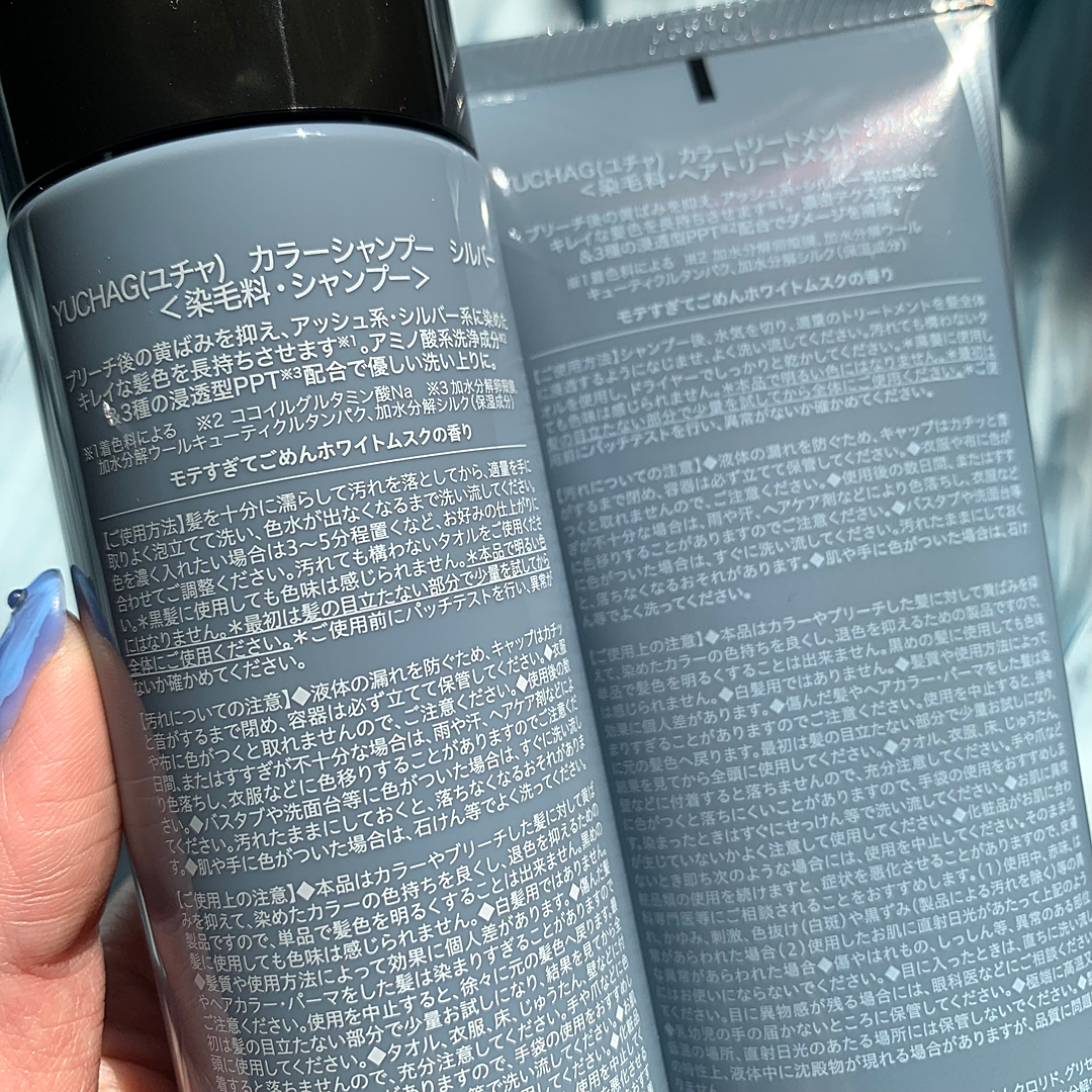 - <パープル シャンプー(200mL)> 水、オレフィン(C14-16)スルホン酸Na、コカミドプロピルベタイン、コカミドDEA、ココイルグルタミン酸Na、加水分解卵殻膜、加水分解ケラチン(羊毛)、加水分解ウールキューティクルタンパク、加水分解シルク、ジラウロイルグルタミン酸リシンNa、γ-ドコサラクトン、アルガニアスピノサ核油、アボカド油、バオバブ種子油、ヒマワリ種子油、ヤシ油、サルビアヒスパニカ種子油、ツボクサエキス、テトラヘキシルデカン酸アスコルビル、ポリクオタニウム-10、リシンHCl、アラニン、アルギニン、ヒスチジンHCl、セリン、プロリン、グルタミン酸、トレオニン、バリン、ロイシン、グリシン、アラントイン、イソロイシン、フェニルアラニン、タウリン、BG、リンゴ酸、エチドロン酸4Na、ヤシ油脂肪酸PEG-7グリセリル、トリ(カプリル酸/カプリン酸)グリセリル、フェノキシエタノール、メチルパラベン、塩基性赤51、塩基性青99、HC赤3、香料 <パープル トリートメント(180g)> 水、セテアリルアルコール、ベヘントリモニウムクロリド、グリセリン、ミネラルオイル、加水分解卵殻膜、加水分解ケラチン(羊毛)、加水分解ウールキューティクルタンパク、加水分解シルク、ジラウロイルグルタミン酸リシンNa、γ-ドコサラクトン、アルガニアスピノサ核油、アボカド油、バオバブ種子油、ヒマワリ種子油、ヤシ油、サルビアヒスパニカ種子油、ツボクサエキス、テトラヘキシルデカン酸アスコルビル、PPG-3カプリリルエーテル、リシンHCl、アラニン、アルギニン、ヒスチジンHCl、セリン、プロリン、グルタミン酸、トレオニン、バリン、ロイシン、グリシン、アラントイン、イソロイシン、フェニルアラニン、ヘマチン、タウリン、ステアロキシプロピルトリモニウムクロリド、エチルヘキサン酸セチル、ヒドロキシエチルセルロース、ステアリルアルコール、イソプロパノール、トリ(カプリル酸/カプリン酸)グリセリル、セタノール、トリデセス-12、フェノキシエタノール、メチルパラベン、エタノール、塩基性青99、塩基性赤51、HC赤3、BG、香料 <ピンク シャンプー(200mL)> 水、オレフィン(C14-16)スルホン酸Na、コカミドプロピルベタイン、コカミドDEA、ココイルグルタミン酸Na、加水分解卵殻膜、加水分解ケラチン(羊毛)、加水分解ウールキューティクルタンパク、加水分解シルク、ジラウロイルグルタミン酸リシンNa、γ-ドコサラクトン、アルガニアスピノサ核油、アボカド油、バオバブ種子油、ヒマワリ種子油、ヤシ油、サルビアヒスパニカ種子油、ツボクサエキス、テトラヘキシルデカン酸アスコルビル、ポリクオタニウム-10、リシンHCl、アラニン、アルギニン、ヒスチジンHCl、セリン、プロリン、グルタミン酸、トレオニン、バリン、ロイシン、グリシン、アラントイン、イソロイシン、フェニルアラニン、タウリン、BG、リンゴ酸、エチドロン酸4Na、ヤシ油脂肪酸PEG-7グリセリル、トリ(カプリル酸/カプリン酸)グリセリル、フェノキシエタノール、メチルパラベン、塩基性赤51、香料 <ピンク トリートメント(180g)> 水、セテアリルアルコール、ベヘントリモニウムクロリド、グリセリン、ミネラルオイル、加水分解卵殻膜、加水分解ケラチン(羊毛)、加水分解ウールキューティクルタンパク、加水分解シルク、ジラウロイルグルタミン酸リシンNa、γ-ドコサラクトン、アルガニアスピノサ核油、アボカド油、バオバブ種子油、ヒマワリ種子油、ヤシ油、サルビアヒスパニカ種子油、ツボクサエキス、テトラヘキシルデカン酸アスコルビル、PPG-3カプリリルエーテル、リシンHCl、アラニン、アルギニン、ヒスチジンHCl、セリン、プロリン、グルタミン酸、トレオニン、バリン、ロイシン、グリシン、アラントイン、イソロイシン、フェニルアラニン、タウリン、ステアロキシプロピルトリモニウムクロリド、エチルヘキサン酸セチル、ヒドロキシエチルセルロース、ステアリルアルコール、イソプロパノール、トリ(カプリル酸/カプリン酸)グリセリル、セタノール、トリデセス-12、BG、フェノキシエタノール、メチルパラベン、塩基性青99、塩基性茶16、塩基性紫2、香料 <シルバー シャンプー(200mL)> 水、オレフィン(C14-16)スルホン酸Na、コカミドプロピルベタイン、コカミドDEA、ココイルグルタミン酸Na、加水分解卵殻膜、加水分解ケラチン(羊毛)、加水分解ウールキューティクルタンパク、加水分解シルク、ジラウロイルグルタミン酸リシンNa、γ-ドコサラクトン、アルガニアスピノサ核油、アボカド油、バオバブ種子油、ヒマワリ種子油、ヤシ油、サルビアヒスパニカ種子油、ツボクサエキス、テトラヘキシルデカン酸アスコルビル、リシンHCl、アラニン、アルギニン、ヒスチジンHCl、セリン、プロリン、グルタミン酸、トレオニン、バリン、ロイシン、グリシン、アラントイン、イソロイシン、フェニルアラニン、タウリン、BG、リンゴ酸、エチドロン酸4Na、ヤシ油脂肪酸PEG-7グリセリル、トリ(カプリル酸/カプリン酸)グリ