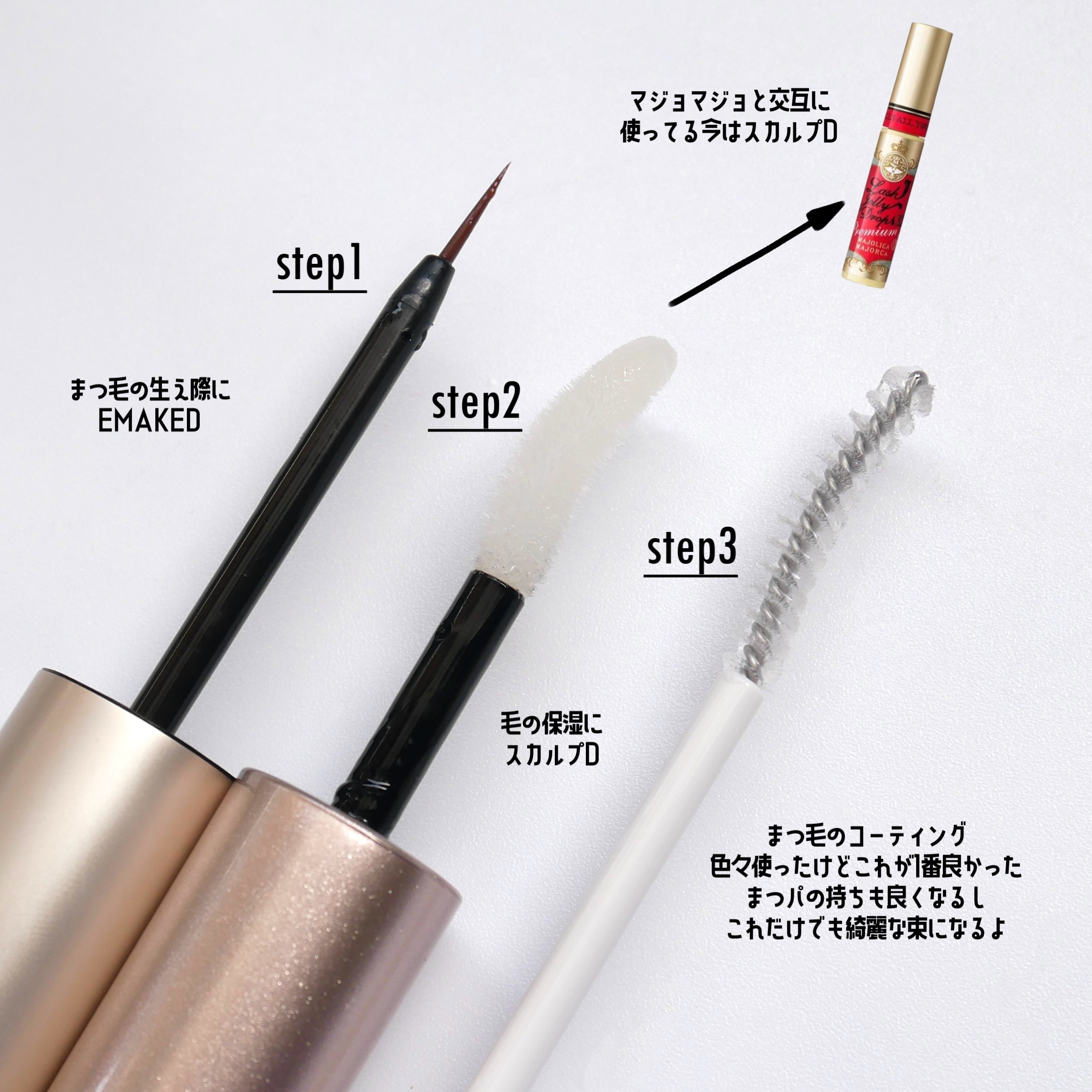 まつ毛美容液を塗ると、 まつ毛が長くなるだけじゃなく、カールしやすくなったり抜けにくくもなります。 まつ毛コームを使うと、着きすぎちゃった余分なマスカラも取れるし、ダマにならないし、綺麗に束感を調節できます。 最後にホットビューラーで整えます。手間かかるけど、ホットビューラー使うようになってから本当にまつ毛褒められる事が増えました。