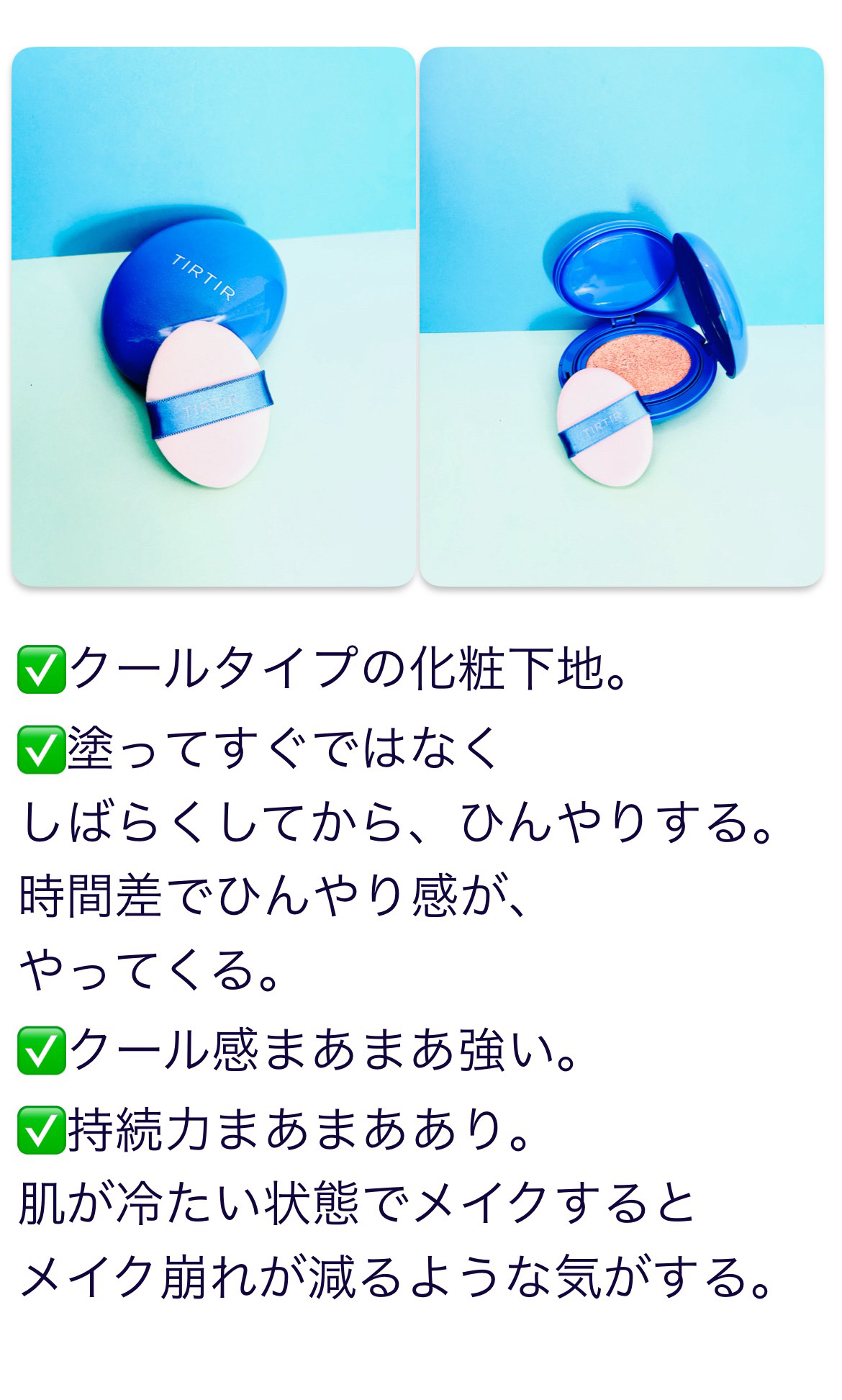 下地 SPF50+ PA++++ 付けてからしばらくして、ひんやり。 フェイスパウダー 10g SPF40 PA+++ ひんやり感強い。持続力もあり。 マット仕上がり。かなり白くなる! メイクフィクサー 80ml 香りあるけど、あまり感じない。