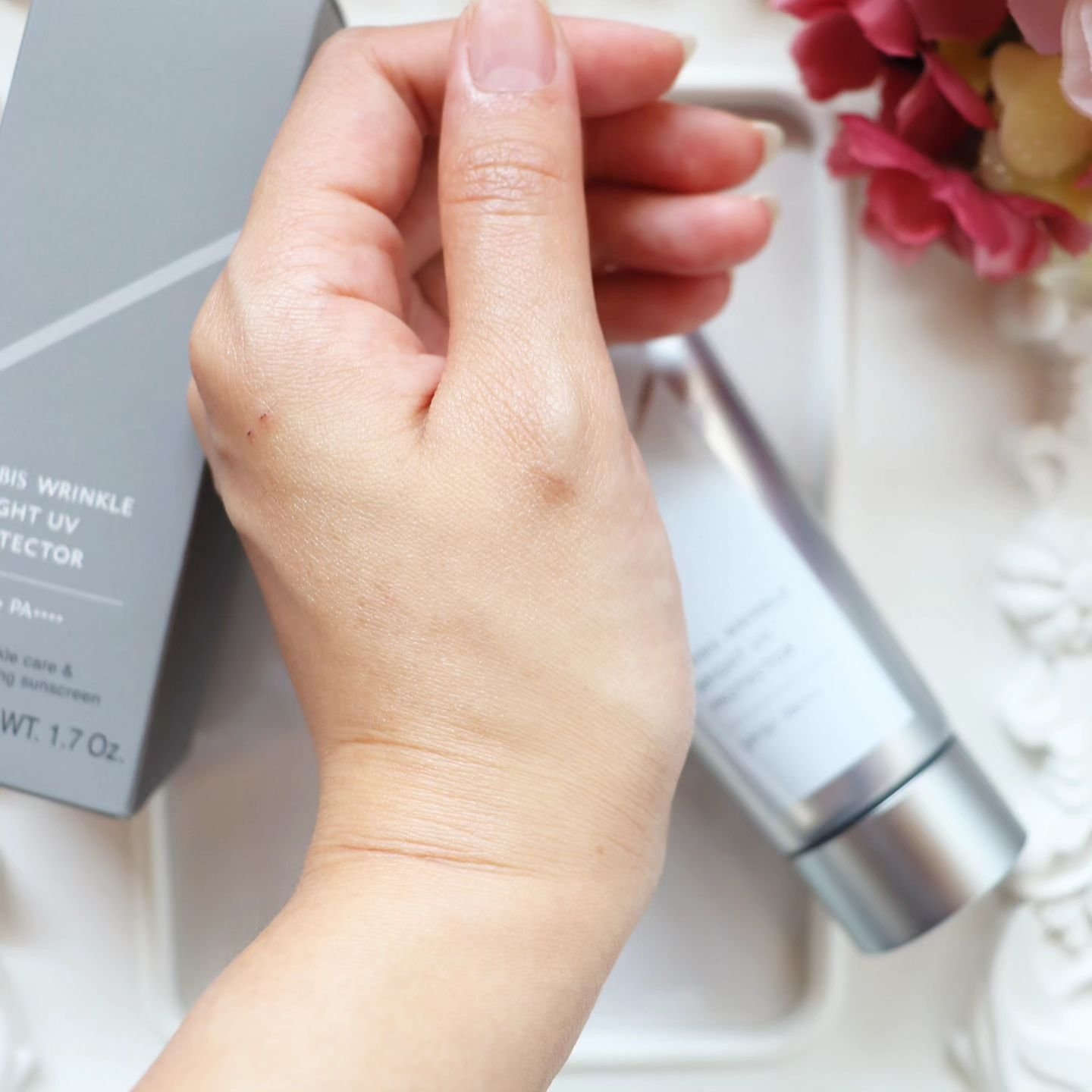 SPF 50 + PA +++と紫外線カット効果も高いのですが、塗り心地は軽いテクスチャーのクリームのようでのびも良く、重たくならないのが良いです😍. 少しだけ外に出るときにもパパッと塗って肌をきれいに見せられて良いです✨️. 自然なトーンアップ効果があるので、首に使って顔と首のトーンの差をなくすのにも良いです💕.